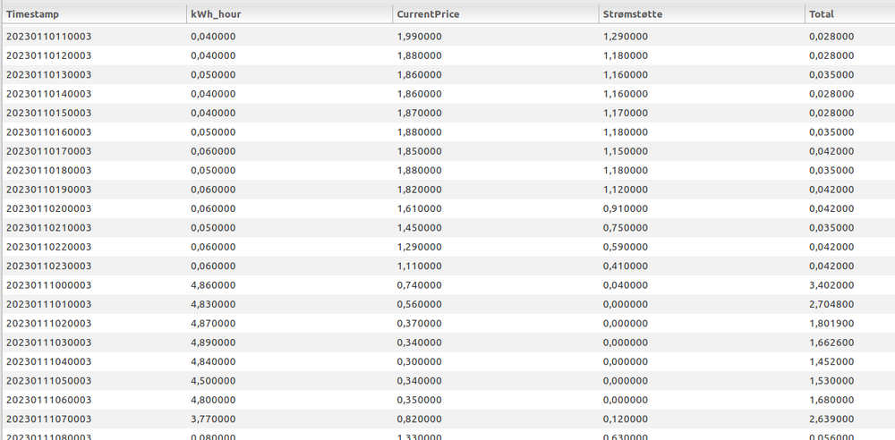 Nå har jeg sittet å knødd og massert noen SQL spørringer i noen timer og tror jeg har funnet et reelt resultat. Utgangspunktet mitt er reelt forbruk i januar i år, til sammen 1217kWh. For å gå rett på resultatet så ville jeg ha betalt: Med gjennomsnittspris for strømstøtte: Kr 1237 Med 80% strømstøtte time for time: Kr 786 Med 90% strømstøtte time for time: Kr 691 Siden jeg konsekvent har kjøpt strøm når den er billig har innsparingen min for januar vært 1237 - 786 = 451 Med den nye ordningen blir der ikke noe stort å hente på å kjøpe strøm om natten annet enn litt lavere nettleie (ikke tatt med i disse tallene). For de som gidder å se hvordan tallene er kommet fram så er det slik: Gjennomsnittspris: SELECT SUM(`kWh_hour` * (`MndPris` - `StromStotte`)) FROM `EnergiV1` WHERE `Timestamp` > 20230000000000 AND `Timestamp` < 20230141000000 Det blir litt vanskeligere med strømstøtte time for time for spørringene gir i utgangspunktet negativ strømstøtte når prisen er under 70 øre. 80% strømstøtte, først i tabellform for å kontrollere resultatet time for time: SELECT `Timestamp`, `kWh_hour`, `CurrentPrice`, CASE WHEN (`CurrentPrice` - 0.70)*1.25*0.80 < 0 THEN 0 ELSE (`CurrentPrice` - 0.70)*1.25*0.80 END AS Strømstøtte, `kWh_hour` * (`CurrentPrice` - CASE WHEN (`CurrentPrice` - 0.70)*1.25*0.80 < 0 THEN 0 ELSE (`CurrentPrice` - 0.70)*1.25*0.80 END) AS Total FROM `EnergiV1` WHERE `Timestamp` > 20230000000000 AND `Timestamp` < 20230141000000 ORDER BY `Timestamp` ASC og et utsnitt av de 744 radene i resultatet ble: Summering med 80%: SELECT SUM(`kWh_hour` * (`CurrentPrice` - CASE WHEN (`CurrentPrice` - 0.70)*1.25*0.80 < 0 THEN 0 ELSE (`CurrentPrice` - 0.70)*1.25*0.80 END)) FROM `EnergiV1` WHERE `Timestamp` > 20230000000000 AND `Timestamp` < 20230141000000 ble Kr 785.72 Samme greiene en gang til for 90% og da ble summen 697.07 Tabellen (eller viewet som det egentlig er, MndPris og StromStotte kommer fra en annen tabell) ser slik ut: -