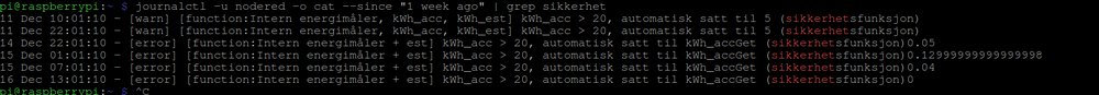 La inn: node.warn(kWh_part) node.warn(kWh_part - 45000000) helt i slutten av scriptet og resultatet er: Blir ikke stort klokere... Men den automatiske feilrettingen gjør jobben, har ikke fått noen katastrofer siden jeg la inn den og eneste ulempen, bortsett at det er å rette feil feil, er at jeg mister 2 sekund energidata en gang og 2 i døgnet og det er uvesentlig.