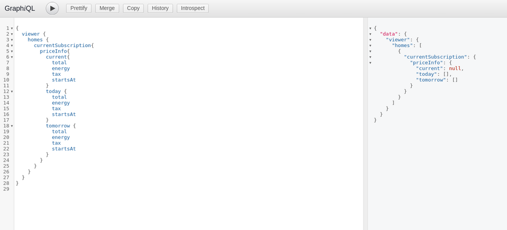 Flere som sliter med Tibber API i dag? Får ikke prisdata inn i NodeRed... Logger jeg på https://developer.tibber.com/explorer og velger "Current energy price" får jeg ingen data med mitt token men det virke med demotoken. Mitt token: Demotoken: Andre data får jeg tilgang til... Ser ikke noe i https://status.tibber.com/ og har sendt epost til Tibber med rapport for et par timer siden.
