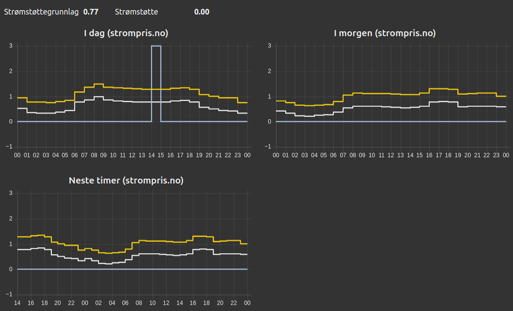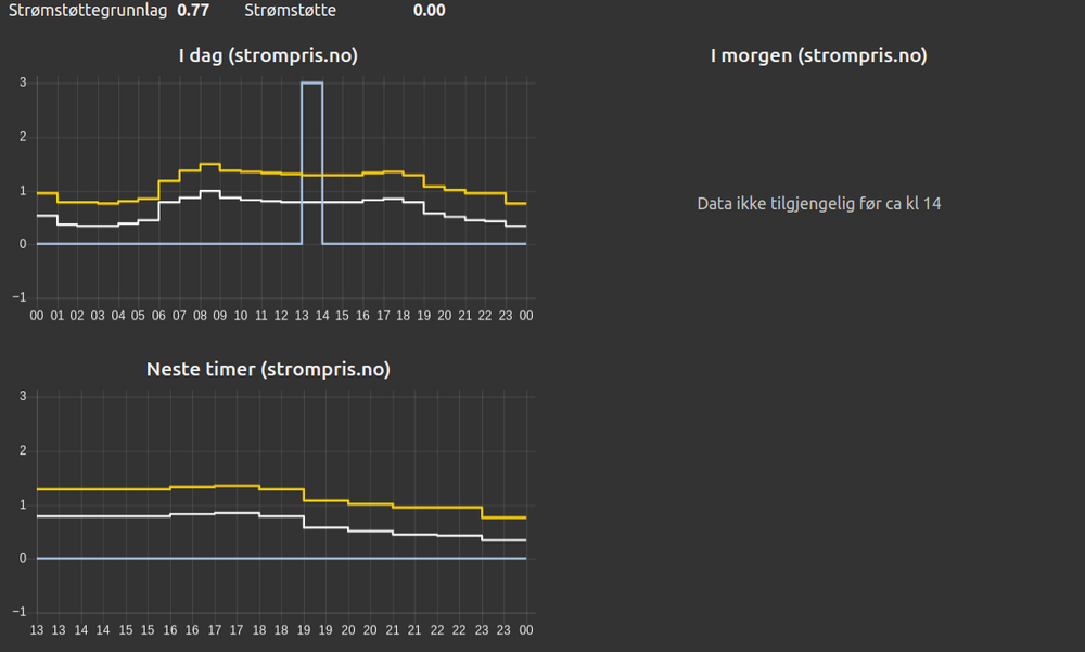 Pynta litt på prisgrafen min med tilleggsgrafer fra strompris.no Jeg har valgt å manuelt skalere grafene ut fra dagens maxpris fordi da blir begge grafene likt skalert. Gul er strømpris inkl nettleie og oransje er også inkl strømstøtte. NodeRed flow for strompris.no: [{"id":"98a1f14badcc52d4","type":"inject","z":"7aa23003bb64f180","name":"","props":[{"p":"payload"},{"p":"topic","vt":"str"}],"repeat":"","crontab":"","once":false,"onceDelay":0.1,"topic":"","payload":"","payloadType":"date","x":90,"y":590,"wires":[["b75cb9337453b567"]]},{"id":"b75cb9337453b567","type":"http request","z":"7aa23003bb64f180","name":"Prisdata fra strompris.no","method":"GET","ret":"obj","paytoqs":"ignore","url":"https://www.strompris.no/api/spotprice/dayprice","tls":"","persist":false,"proxy":"","insecureHTTPParser":false,"authType":"","senderr":false,"x":490,"y":570,"wires":[["5af895dfdebfa5f0","b6c7050f8421f228","1de4bfd3e92dce19"]]},{"id":"5c1057a587cd508c","type":"comment","z":"7aa23003bb64f180","name":"Alternative prisdata","info":"","x":100,"y":560,"wires":[]},{"id":"5862895d457e1a88","type":"ui_chart","z":"7aa23003bb64f180","name":"elpriser i dag (strompris.no)","group":"f92abb1b.7c98d8","order":18,"width":14,"height":"9","label":"I dag (strompris.no)","chartType":"line","legend":"false","xformat":"HH","interpolate":"step","nodata":"wait","dot":false,"ymin":"-2","ymax":"6","removeOlder":"24","removeOlderPoints":"100","removeOlderUnit":"3600","cutout":0,"useOneColor":true,"useUTC":false,"colors":["#edd400","#aec7e8","#ff7f0e","#f7f7f7","#98df8a","#d62728","#ff9896","#9467bd","#c5b0d5"],"outputs":1,"useDifferentColor":false,"className":"","x":1240,"y":530,"wires":[[]]},{"id":"5af895dfdebfa5f0","type":"function","z":"7aa23003bb64f180","name":"Prepare for alt. chart","func":"var d = new Date();\nd.setDate(d.getDate());\nvar currHour = d.getHours();\nvar weekDay = d.getDay()+1;\nvar pdt=0; //PrisDenneTime for kalkulasjoner\nvar sst = flow.get(\"sst\") || 0; //Strømstøtte\nvar nld = flow.get(\"nld\") ||0.51; //NettLeieDag 06-22\nvar nlnh = flow.get(\"nlnh\") || 0.41; //NettLeieNatt 22-06 + Helg\nvar priceHour = 0;\n//var priceHourTimestamp = new Date();\nvar msg2 = [[],[],[],[]];\nmsg2.payload = [{\"series\":[\"Råpris+nl\",\".\",\"Jonaspris\",\"0\"], \"data\": [[],[],[],[]], \"labels\": []}];\n\n//node.warn(msg.payload.today.hourly[0].NO2);\n\nif (msg.payload.today.hourly != null) {\n //msg2.topic = msg.payload.today.hourly[0].Hours;\n //node.warn(msg.payload);\n\n for ( var i in msg.payload.today.hourly){\n priceHour = msg.payload.today.hourly[i].Hours;\n pdt = msg.payload.today.hourly[i].NO2;\n \n var priceHourTimestamp = new Date(2022,10,10,priceHour,0,0,0); //Spiller ingen rolle hvilken dato, bruker bare timen uansett\n //node.warn(priceHourTimestamp + \" \" + pdt);\n msg2.topic = priceHour;\n //{topic:\"temperature\", payload:22}\n //{topic:\"humidity\", payload:66}\n //msg2.payload[0].data[0][i] = {\"x\": Number(priceHourTimestamp), \"y\": pdt};\n //msg2.payload[0].data[1][i] = {\"x\": Number(priceHour), \"y\": priceHour};\n //msg2.payload[0].data[2][i] = {\"x\": Number(priceHour), \"y\": 0};\n //msg2.payload[0].data[3][i] = {\"x\": Number(priceHourTimestamp), \"y\": 0};\n //msg2.payload[0].labels[i] = priceHourTimestamp;\n \n //Beregn reel pris medregnet nettleie og strømstøtte\n if ((priceHour > 6) && (priceHour <= 22) && weekDay < 6) {\n msg2.payload[0].data[0][i] = {\"x\": Number(priceHourTimestamp), \"y\": (pdt + nld).toFixed(2)};\n msg2.payload[0].data[2][i] = {\"x\": Number(priceHourTimestamp), \"y\": (pdt - sst + nld).toFixed(2)};\n // node.warn(\"Dag: \" + priceHour + \" \" + msg.payload[0].data[2][i] + \"pdt: \" + pdt);\n }\n else{\n msg2.payload[0].data[0][i] = {\"x\": Number(priceHourTimestamp), \"y\": (pdt + nlnh).toFixed(2)};\n msg2.payload[0].data[2][i] = {\"x\": Number(priceHourTimestamp), \"y\": (pdt - sst + nlnh).toFixed(2)};\n // node.warn(\"Natt: \" + priceHour + \" \" + msg.payload[0].data[2][i] + \"pdt: \" + pdt);\n }\n // Add \"Now\" marker og lagre prisdata\n if (priceHour == currHour){\n msg2.payload[0].data[1][i] = {\"x\": Number(priceHourTimestamp), \"y\": 3};\n }\n else{\n msg2.payload[0].data[1][i] = {\"x\": Number(priceHourTimestamp), \"y\": 0};\n }\n\n}\n\n\n// Quick and dirty fix: legg till time #24\npriceHourTimestamp = new Date(2022,10,10,24,0,0,0);\nmsg2.payload[0].data[0][24] = {\"x\": Number(priceHourTimestamp), \"y\": (pdt + nlnh).toFixed(2)};\nmsg2.payload[0].data[2][24] = {\"x\": Number(priceHourTimestamp), \"y\": (pdt - sst + nlnh).toFixed(2)};\n//msg.payload[0].labels[24] = \"00\";\nmsg2.payload[0].data[1][24] = {\"x\": Number(priceHourTimestamp), \"y\": 0};\n \n}\nelse{\n msg2.payload = []; // Slett graf når data ikke er tilgjengelige\n node.warn(\"Graf for i morgen slettet\")\n\n}\nmsg.payload = msg2.payload;\nnode.warn(msg.payload);\nreturn msg; \n","outputs":1,"noerr":0,"initialize":"","finalize":"","libs":[],"x":820,"y":530,"wires":[["5862895d457e1a88"]]},{"id":"70381f110be599d2","type":"inject","z":"7aa23003bb64f180","name":"Eksempeldata","props":[{"p":"payload"}],"repeat":"","crontab":"","once":false,"onceDelay":0.1,"topic":"","payload":"{\"today\":{\"average\":{\"NO1\":1.4548520833333332,\"NO2\":1.4713010416666668,\"NO3\":0.4447307291666666,\"NO4\":0.2162920833333333,\"NO5\":1.4548520833333332},\"hourly\":[{\"NO1\":1.1531,\"NO2\":1.1531,\"NO3\":0.41159999999999997,\"NO4\":0.22135,\"NO5\":1.1531,\"Hours\":\"0\"},{\"NO1\":1.2058,\"NO2\":1.2058,\"NO3\":0.3741875,\"NO4\":0.21378999999999998,\"NO5\":1.2058,\"Hours\":\"1\"},{\"NO1\":1.2313125,\"NO2\":1.2313125,\"NO3\":0.38712499999999994,\"NO4\":0.20902,\"NO5\":1.2313125,\"Hours\":\"2\"},{\"NO1\":1.2045124999999999,\"NO2\":1.2045124999999999,\"NO3\":0.4208,\"NO4\":0.20695,\"NO5\":1.2045124999999999,\"Hours\":\"3\"},{\"NO1\":1.2337624999999999,\"NO2\":1.2337624999999999,\"NO3\":0.43956249999999997,\"NO4\":0.20944,\"NO5\":1.2337624999999999,\"Hours\":\"4\"},{\"NO1\":1.3723125,\"NO2\":1.3723125,\"NO3\"