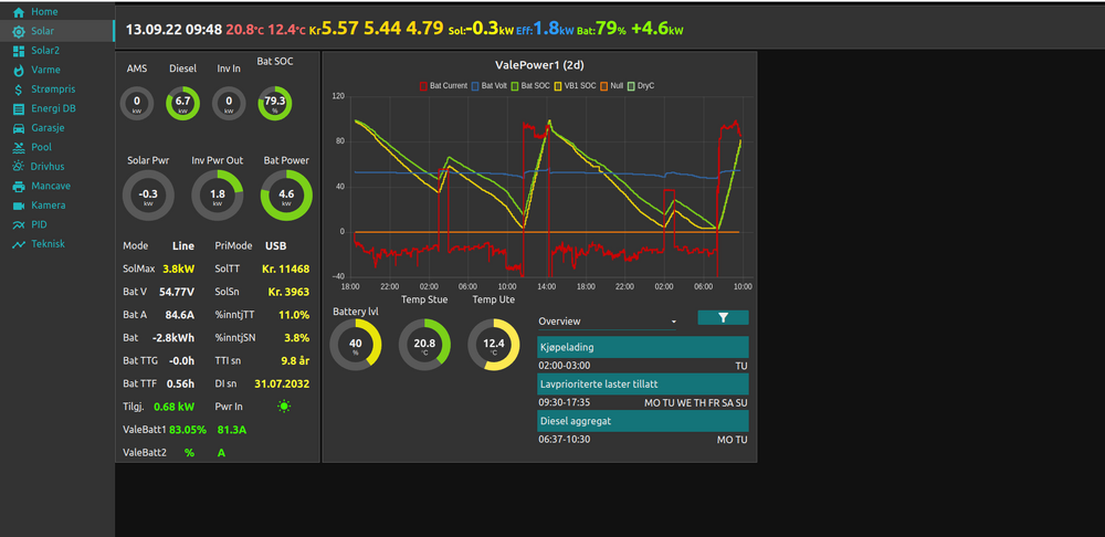 25. Jeg har jo lagret en del timedata siden i fjor men så langt har jeg bare kunnet vise de siste 7 eller 31 dagene med eller uten SOC men siden dataene ligger klar for bruk i MariaDB SQL server måtte jeg snekre litt videre på løsningen min... Dette her er slik jeg hadde det tidligere, et av 4 valg: Men med knappene nederst er det kjapt å hente mer data ut: Tenker å kanskje utvide med litt statistiske data for valgt periode men det får bli en annen gang... Kjapt fortalt: MC4 kontakter må sikres slik at de ikke kan åpnes uten verktøy. Strips som blokkerer låselippene er ok, da må du ha avbiter for å åpne de. Merking av div utstyr og kabler med gul trekant med lyn. Avdekking av alt 48V koblinger, også minus... Jordfeilvern type B Utvendig merking på bygg. Samsvarserklæring på inverter (NEK EN 62109) Jording av batterirack. Brukerdokumentasjon.