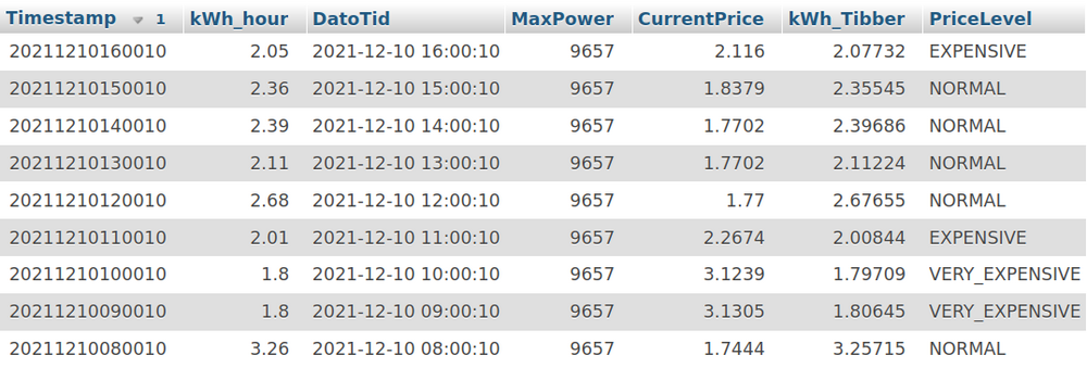 En smule mer komplisert SQL... SELECT LEFT(Timestamp,8) AS "Dato", CAST(SUM(CurrentPrice)/COUNT(*) * SUM(kWh_Tibber)/COUNT(*) * 24 as decimal(10,2)) AS 'Snittpris', CAST(SUM(CurrentPrice * kWh_Tibber)/COUNT(*) * 24 as decimal(10,2)) AS 'ReellPris', CAST((SUM(CurrentPrice)/COUNT(*) * SUM(kWh_Tibber)/COUNT(*) * 24) - (SUM(CurrentPrice * kWh_Tibber)/COUNT(*) * 24) as decimal(10,2)) AS "Spart" FROM Energi GROUP BY LEFT(Timestamp,8) ORDER BY Timestamp DESC ender opp i denne: Ser ut til at jeg noen ganger taper penger på å flytte forbruk til billigere tidsrom, det virket litt merkelig...