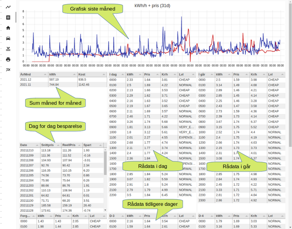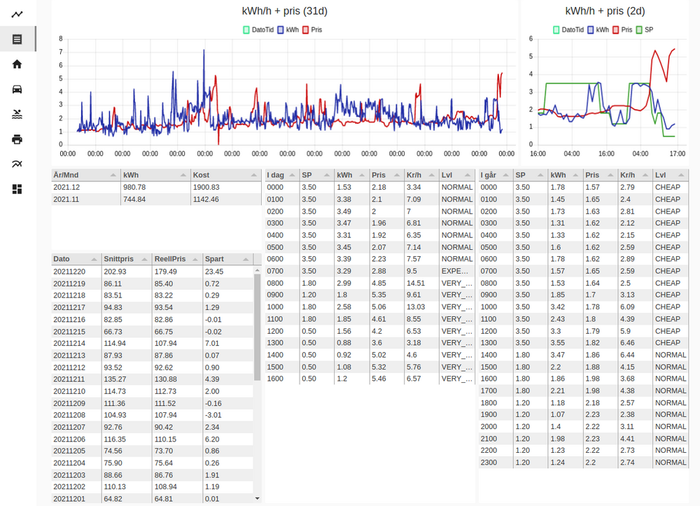 Inspirert av @stigvi sin besparelseskalkulator måtte jeg prøve meg selv litt. Jeg har en enkel SQL tabell som lagrer pris og forbruk hver time: En bittelitt komplisert SQL spørring som dette: SELECT LEFT(Timestamp,8) AS "Dato", (SUM(CurrentPrice)/COUNT(*) * SUM(kWh_Tibber)/COUNT(*)) * 24 AS "Snittpris", (SUM(CurrentPrice * kWh_Tibber)/COUNT(*)) * 24 AS "ReellPris" FROM Energi GROUP BY LEFT(Timestamp,8) ORDER BY Timestamp DESC gir et, tror jeg, fornuftig estimat over mine reelle strømkostnader pr døgn sammenlignet med en gjennomsnittspris for hele døgnet. Resultatet gir et bilde kun av det jeg sparer på å flytte forbruket til billigere perioder i stedet for å betale normalpris for det tidspunktet jeg normalt ville brukt den energien: Da gjenstår bare å subtrahere kolonnene for å få et direkte tall på besparelse. Kan en slik 4. kolonne bygges inn i SQL spørringen? Har gjort noen spede forsøk men kom ikke så langt...