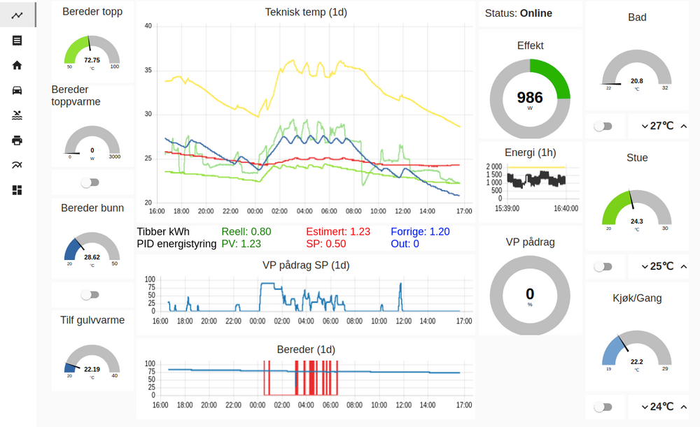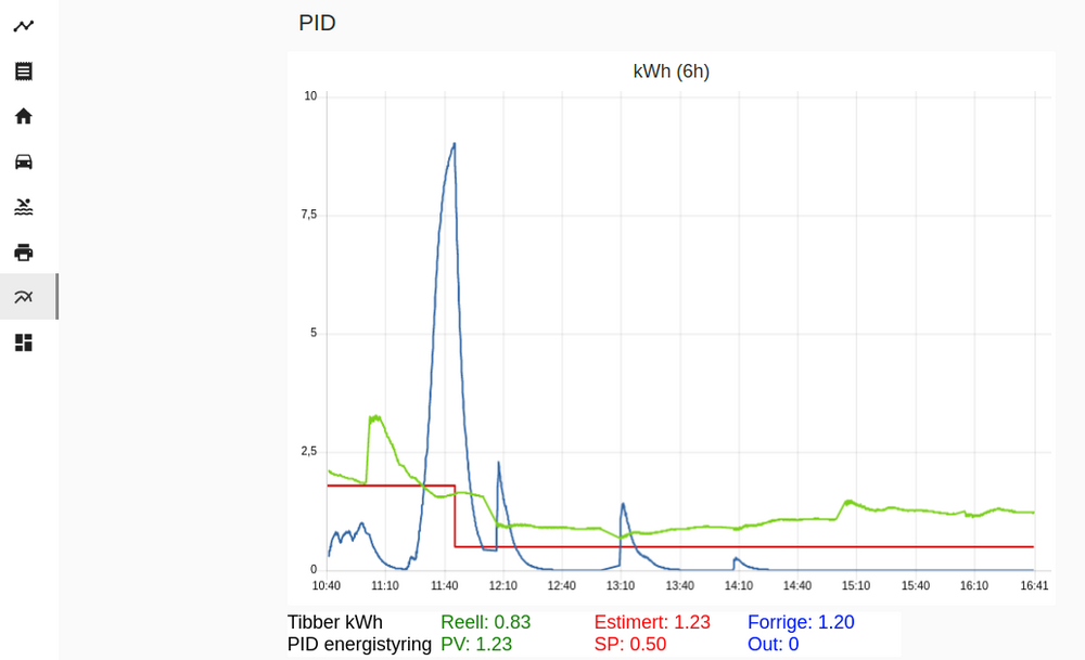 Har putlet litt mer med NodeRed Dashboard og laget meg 2-3 bilder som gir meg god oversikt over energiforbruket i huset. Først de største forbrukerene med PID regulator, krampesparing i dag med all-time-high strømpris så langt, blir verre i morgen: Kun PID for litt god oversikt for tuning: Og til sist: Henting og visning av loggede data fra SQL: