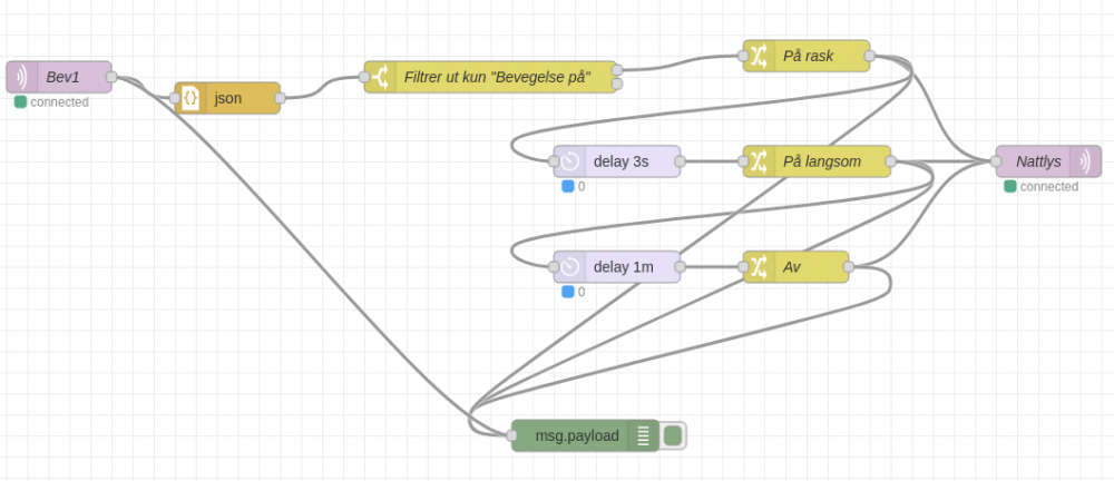 Begynte i natt å se litt på Node-Red og har nå fått til litt greier men trenger litt hjelp... Har en bevegelsessensor som skal slå på nattlys litt stille og rolig og slå av igjen etter en tid. Denne sender følgende via mqtt: Jeg ønsker å filtrerer ut "occupancy" og kjøre en flow når denne er "true". Lyset går da raskt opp til 30 for så å sakte gå opp til 100. 1 minutt senere skal det sakte slå seg av igjen. Denne flowen fungerer for så vidt men ved flere aktiveringer legger der seg flere "slå av" kommandoer i kø og det er ikke så lurt. Tatt i betraktning at jeg er heeeeelt fersk på Node-Red så er jeg fornøyd med at det virker sånn noenlunde men regner med det er ultraklønete laget. Noen som vil guide meg litt på vei? Noen flere parameter trengs også etterhvert som f.eks. er det ikke nødvendig med nattlys på dagtid, enten ut fra soloppgang/nedgang eller kanskje litt mer elegant vha. lyssensoren i bevegelssensoren. [{"id":"6e716fb5.71658","type":"tab","label":"Flow 2"},{"id":"8f9a50d4b09f6554","type":"mqtt in","z":"6e716fb5.71658","name":"Bev1","topic":"zigbee2mqtt/HUE/Sov1Beveg","qos":"0","datatype":"auto","broker":"6db118ed1b0c56de","nl":false,"rap":true,"rh":0,"x":190,"y":300,"wires":[["6be4bd0d5ef4eefb","a9c4f1bd5c640d81"]]},{"id":"042eecf372789b8e","type":"mqtt out","z":"6e716fb5.71658","name":"Nattlys","topic":"zigbee2mqtt/HUE/NattlysSov1/set","qos":"2","retain":"","respTopic":"","contentType":"","userProps":"","correl":"","expiry":"","broker":"6db118ed1b0c56de","x":1230,"y":380,"wires":[]},{"id":"9abd98fd718357d6","type":"switch","z":"6e716fb5.71658","name":"Filtrer ut kun \"Bevegelse på\"","property":"payload.occupancy","propertyType":"msg","rules":[{"t":"cont","v":"true","vt":"str"}],"checkall":"true","repair":false,"outputs":1,"x":580,"y":300,"wires":[["cd90cb56d0f52093"]],"outputLabels":["True"]},{"id":"6be4bd0d5ef4eefb","type":"json","z":"6e716fb5.71658","name":"","property":"payload","action":"","pretty":true,"x":360,"y":300,"wires":[["9abd98fd718357d6"]]},{"id":"d118a9f20f32cace","type":"change","z":"6e716fb5.71658","name":"På langsom","rules":[{"t":"set","p":"payload","pt":"msg","to":"{\"brightness\":100,\"transition\":25}","tot":"str"}],"action":"","property":"","from":"","to":"","reg":false,"x":910,"y":380,"wires":[["042eecf372789b8e","a9c4f1bd5c640d81","555f9fffe3349a6b"]]},{"id":"599f78525155c46b","type":"change","z":"6e716fb5.71658","name":"Av","rules":[{"t":"set","p":"payload","pt":"msg","to":"{\"brightness\":0,\"transition\":30}","tot":"str"}],"action":"","property":"","from":"","to":"","reg":false,"x":890,"y":480,"wires":[["042eecf372789b8e","a9c4f1bd5c640d81"]]},{"id":"555f9fffe3349a6b","type":"delay","z":"6e716fb5.71658","name":"","pauseType":"delay","timeout":"1","timeoutUnits":"minutes","rate":"1","nbRateUnits":"1","rateUnits":"minute","randomFirst":"1","randomLast":"5","randomUnits":"seconds","drop":true,"allowrate":false,"x":720,"y":480,"wires":[["599f78525155c46b"]]},{"id":"cd90cb56d0f52093","type":"change","z":"6e716fb5.71658","name":"På rask","rules":[{"t":"set","p":"payload","pt":"msg","to":"{\"brightness\":30,\"transition\":1}","tot":"str"}],"action":"","property":"","from":"","to":"","reg":false,"x":900,"y":280,"wires":[["042eecf372789b8e","a9c4f1bd5c640d81","0ccec4c709bd297b"]]},{"id":"0ccec4c709bd297b","type":"delay","z":"6e716fb5.71658","name":"","pauseType":"delay","timeout":"3","timeoutUnits":"seconds","rate":"1","nbRateUnits":"1","rateUnits":"second","randomFirst":"1","randomLast":"5","randomUnits":"seconds","drop":false,"allowrate":false,"x":720,"y":380,"wires":[["d118a9f20f32cace"]]},{"id":"a9c4f1bd5c640d81","type":"debug","z":"6e716fb5.71658","name":"","active":true,"tosidebar":true,"console":false,"tostatus":false,"complete":"false","statusVal":"","statusType":"auto","x":850,"y":640,"wires":[]},{"id":"6db118ed1b0c56de","type":"mqtt-broker","name":"DaleMQTT","broker":"172.16.0.94","port":"1883","clientid":"","usetls":false,"protocolVersion":"4","keepalive":"60","cleansession":true,"birthTopic":"","birthQos":"0","birthPayload":"","birthMsg":{},"closeTopic":"","closeQos":"0","closePayload":"","closeMsg":{},"willTopic":"","willQos":"0","willPayload":"","willMsg":{},"sessionExpiry":""}]