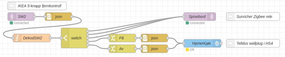 Putler i vei litt videre. Poster her når jeg har fått "hull på byllen", dvs. fått ting til å virke. Denne gangen er det en IKEA rund 5-knapp fjernkontroll via zigbee2mqtt som styrer en wallplug i HS4 og er Sunricher rele via mqtt/zigbee2mqtt: Litt for andre og litt for meg selv som huskeliste 😉 [{"id":"0e1f5a47dab01ac8","type":"tab","label":"IKEA Remote SW2","disabled":false,"info":""},{"id":"e7d4221599ac53c2","type":"mqtt in","z":"0e1f5a47dab01ac8","name":"SW2","topic":"zigbee2mqtt/IKEA/Tradfri_SW2","qos":"2","datatype":"auto","broker":"6db118ed1b0c56de","nl":false,"rap":true,"rh":0,"x":90,"y":80,"wires":[["1e2e7dccdd786a5f"]]},{"id":"40365f1ed2766793","type":"mqtt out","z":"0e1f5a47dab01ac8","name":"Spisebord","topic":"zigbee2mqtt/Lys/Spisebord/set","qos":"0","retain":"","respTopic":"","contentType":"","userProps":"","correl":"","expiry":"","broker":"6db118ed1b0c56de","x":760,"y":80,"wires":[]},{"id":"1e2e7dccdd786a5f","type":"json","z":"0e1f5a47dab01ac8","name":"","property":"payload","action":"obj","pretty":false,"x":230,"y":80,"wires":[["064e9d908740e547"]]},{"id":"064e9d908740e547","type":"function","z":"0e1f5a47dab01ac8","name":"DekodSW2","func":"var svar = \"\";\nvar action=msg.payload.action;\nif (action==\"toggle\") {\n svar= {payload:\"TOGGLE\"};\n}\nif (action==\"brightness_up_click\") {\n svar= {payload:\"ON\"};\n}\nif (action==\"brightness_down_click\") {\n svar= {payload:\"OFF\"};\n}\nif (action==\"arrow_left_click\") {\n svar= {payload:\"L\"};\n}\nif (action==\"arrow_right_click\") {\n svar= {payload:\"R\"};\n}\n\nreturn svar;","outputs":1,"noerr":0,"initialize":"","finalize":"","libs":[],"x":130,"y":160,"wires":[["07fb951a50e9c8c6"]]},{"id":"ecd3c99e5f1797a0","type":"hs-device","z":"0e1f5a47dab01ac8","name":"HjerterKjøk","device":"1688","server":"8cea2f7d775df12f","feature":0,"reportonstartup":false,"x":770,"y":180,"wires":[[]]},{"id":"07fb951a50e9c8c6","type":"switch","z":"0e1f5a47dab01ac8","name":"","property":"payload","propertyType":"msg","rules":[{"t":"eq","v":"ON","vt":"str"},{"t":"eq","v":"OFF","vt":"str"},{"t":"eq","v":"TOGGLE","vt":"str"},{"t":"eq","v":"L","vt":"str"},{"t":"eq","v":"R","vt":"str"}],"checkall":"true","repair":true,"outputs":5,"x":290,"y":160,"wires":[["40365f1ed2766793"],["40365f1ed2766793"],["40365f1ed2766793"],["6d6a304991a8d20b"],["579dcb740e976515"]],"outputLabels":["","","","Ev1","Ev2"]},{"id":"579dcb740e976515","type":"change","z":"0e1f5a47dab01ac8","name":"Av","rules":[{"t":"set","p":"topic","pt":"msg","to":"control","tot":"str"},{"t":"set","p":"payload","pt":"msg","to":"{\"status\":\"OFF\"}","tot":"str"}],"action":"","property":"","from":"","to":"","reg":false,"x":470,"y":200,"wires":[["c1e0bc0d7ac004f4"]]},{"id":"c1e0bc0d7ac004f4","type":"json","z":"0e1f5a47dab01ac8","name":"","property":"payload","action":"","pretty":false,"x":590,"y":200,"wires":[["ecd3c99e5f1797a0"]]},{"id":"6d6a304991a8d20b","type":"change","z":"0e1f5a47dab01ac8","name":"På","rules":[{"t":"set","p":"topic","pt":"msg","to":"control","tot":"str"},{"t":"set","p":"payload","pt":"msg","to":"{\"status\":\"ON\"}","tot":"str"}],"action":"","property":"","from":"","to":"","reg":false,"x":470,"y":160,"wires":[["49dbaad0fe1bd6b0"]]},{"id":"49dbaad0fe1bd6b0","type":"json","z":"0e1f5a47dab01ac8","name":"","property":"payload","action":"","pretty":false,"x":590,"y":160,"wires":[["ecd3c99e5f1797a0"]]},{"id":"bf58b55dadacba35","type":"comment","z":"0e1f5a47dab01ac8","name":"Telldus wallplug i HS4","info":"","x":960,"y":180,"wires":[]},{"id":"6097e1532a616b0b","type":"comment","z":"0e1f5a47dab01ac8","name":"Sunricher Zigbee rele","info":"","x":960,"y":80,"wires":[]},{"id":"8de42efafb168028","type":"comment","z":"0e1f5a47dab01ac8","name":"IKEA 5-knapp fjernkontroll","info":"","x":150,"y":40,"wires":[]},{"id":"6db118ed1b0c56de","type":"mqtt-broker","name":"DaleMQTT","broker":"172.16.0.94","port":"1883","clientid":"","usetls":false,"protocolVersion":"4","keepalive":"60","cleansession":true,"birthTopic":"","birthQos":"0","birthPayload":"","birthMsg":{},"closeTopic":"","closeQos":"0","closePayload":"","closeMsg":{},"willTopic":"","willQos":"0","willPayload":"","willMsg":{},"sessionExpiry":""},{"id":"8cea2f7d775df12f","type":"hs-server","name":"HS4","host":"172.16.0.102","port":"80"}]