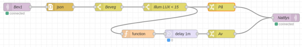 Da har jeg forenklet litt og fått det til å virke tilfredsstillende: [{"id":"6e716fb5.71658","type":"tab","label":"Flow 2"},{"id":"8f9a50d4b09f6554","type":"mqtt in","z":"6e716fb5.71658","name":"Bev1","topic":"zigbee2mqtt/HUE/Sov1Beveg","qos":"0","datatype":"auto","broker":"6db118ed1b0c56de","nl":false,"rap":true,"rh":0,"x":170,"y":160,"wires":[["b1faf566507cd1bb"]]},{"id":"042eecf372789b8e","type":"mqtt out","z":"6e716fb5.71658","name":"Nattlys","topic":"zigbee2mqtt/HUE/NattlysSov1/set","qos":"","retain":"","respTopic":"","contentType":"","userProps":"","correl":"","expiry":"","broker":"6db118ed1b0c56de","x":1170,"y":200,"wires":[]},{"id":"599f78525155c46b","type":"change","z":"6e716fb5.71658","name":"Av","rules":[{"t":"set","p":"payload","pt":"msg","to":"{\"brightness\":0,\"transition\":60}","tot":"str"}],"action":"","property":"","from":"","to":"","reg":false,"x":930,"y":260,"wires":[["042eecf372789b8e"]]},{"id":"555f9fffe3349a6b","type":"delay","z":"6e716fb5.71658","name":"","pauseType":"delay","timeout":"1","timeoutUnits":"minutes","rate":"1","nbRateUnits":"1","rateUnits":"minute","randomFirst":"1","randomLast":"5","randomUnits":"seconds","drop":true,"allowrate":false,"x":780,"y":260,"wires":[["599f78525155c46b"]]},{"id":"cd90cb56d0f52093","type":"change","z":"6e716fb5.71658","name":"På","rules":[{"t":"set","p":"payload","pt":"msg","to":"{\"brightness\":150,\"transition\":15}","tot":"str"}],"action":"","property":"","from":"","to":"","reg":false,"x":930,"y":160,"wires":[["042eecf372789b8e"]]},{"id":"b1faf566507cd1bb","type":"json","z":"6e716fb5.71658","name":"","property":"payload","action":"","pretty":false,"x":330,"y":160,"wires":[["317aadc39d87352b"]]},{"id":"317aadc39d87352b","type":"switch","z":"6e716fb5.71658","name":"Beveg","property":"payload.occupancy","propertyType":"msg","rules":[{"t":"true"}],"checkall":"true","repair":false,"outputs":1,"x":510,"y":160,"wires":[["1ba54974b376c742"]]},{"id":"1ba54974b376c742","type":"switch","z":"6e716fb5.71658","name":"Illum LUX < 15","property":"payload.illuminance_lux","propertyType":"msg","rules":[{"t":"lt","v":"15","vt":"str"}],"checkall":"true","repair":false,"outputs":1,"x":720,"y":160,"wires":[["cd90cb56d0f52093","4b62b6861f671f57"]]},{"id":"4b62b6861f671f57","type":"function","z":"6e716fb5.71658","name":"","func":"msg.delay = 60000;\nvar m1 = {reset:true};\nreturn [[m1,msg]];","outputs":1,"noerr":0,"initialize":"","finalize":"","libs":[],"x":620,"y":260,"wires":[["555f9fffe3349a6b"]]},{"id":"6db118ed1b0c56de","type":"mqtt-broker","name":"DaleMQTT","broker":"172.16.0.94","port":"1883","clientid":"","usetls":false,"protocolVersion":"4","keepalive":"60","cleansession":true,"birthTopic":"","birthQos":"0","birthPayload":"","birthMsg":{},"closeTopic":"","closeQos":"0","closePayload":"","closeMsg":{},"willTopic":"","willQos":"0","willPayload":"","willMsg":{},"sessionExpiry":""}] Takker og bukker for hjelpen. Veldig greit å kjøre Node-Red parallellt med HomeSeer
