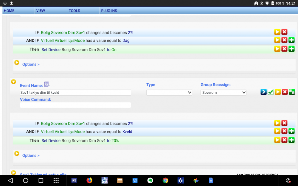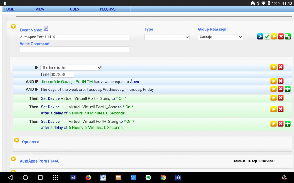 Tenkte å samle en del gode ideer til smarte automasjoner her. Da tenker jeg ikke på de aller enkleste som å slå på lys når bevegelssensor aktiveres (med mindre en har en ekstra smart vri på det da) eller kilometerlange script som krever doktorgrad i bitets anatomi for å skjønne en promille av men rett og slett ideer til litt enkle og smarte ting. Ønsker at innleggene her skal falle inn under Richard Bransons filisofi: For å begynne med en slik sak jeg synes er litt smart: Guttungen sykler vanligvis til skolen ca kl 08:15. Da åpner jeg garasjeporten manuelt via HSTouch eller mobilappen til HS litt før han går. Det smarte ligger i et event: Hvis porten er åpen kl 08:20 stenges den og åpner igjen litt før han er ventende hjem igjen og stenger en halvtime etter det igjen. Tidspunktene vil variere litt med hvilken ukedag det er og pr i dag har jeg 2 events som tar hensyn til de forskjellige skoledagene. Er ikke porten åpen kl 08:20 skjer ingenting. Porten stenges automatisk om kvelden om jeg skulle ha glemt den åpen.
