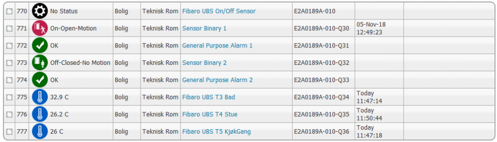 "Show all" hjelper ikke, kun 1 child likevel. Dette er ENESTE gangen jeg har sett 2 child i loggen, ny rescan ble slik: sep-26 13.48.09 Z-Wave 1 out of 2 Child devices of node 2 were created successfully. sep-26 13.48.08 Z-Wave Getting association information for Node 2 Z-Wave Z-Wave.Me Multilevel Sensor sep-26 13.48.08 Z-Wave Assigning return route from node 1 to Node 2 Z-Wave Z-Wave.Me Multilevel Sensor sep-26 13.48.08 Z-Wave Testnett-ZW: Adding association for Z-Wave device Node 2 Z-Wave Z-Wave.Me Multilevel Sensor (Node 2, Group 1, Endpoint 1) to HomeSeer sep-26 13.48.08 Z-Wave All associations for node 2 have been retrieved successfully, it supports associations on these groups: 1. sep-26 13.48.08 Z-Wave Node 2 Association Group 1 can have 8 associations, and currently has 1 sep-26 13.48.07 Z-Wave Getting association information for node 2 sep-26 13.48.07 Z-Wave Processing Information for Node 2 Multi-CHANNEL Command Class of SENSOR_MULTILEVEL, Endpoint 3 sep-26 13.48.07 Z-Wave Processing Information for Node 2 Multi-CHANNEL Command Class of SENSOR_MULTILEVEL, Endpoint 2 sep-26 13.48.07 Z-Wave Processing Information for Node 2 Multi-CHANNEL Command Class of SENSOR_MULTILEVEL, Endpoint 1 sep-26 13.48.06 Z-Wave Node 2 is a Z-Wave Plus node. Retrieving ZWPlus Info... sep-26 13.48.06 Z-Wave Node 2 is Z-Wave version: Lib: 4,38 App: 2.15 sep-26 13.48.06 Z-Wave Node: 2 Supports Class(es): ZWAVEPLUS_INFO, CONFIGURATION, ASSOCIATION, MULTI_CHANNEL_ASSOCIATION_V2, MULTI_CHANNEL_V4, FIRMWARE_UPDATE_MD_V4, DEVICE_RESET_LOCALLY, ASSOCIATION_GRP_INFO, POWERLEVEL, VERSION_V2, MANUFACTURER_SPECIFIC_V2, SENSOR_MULTILEVEL sep-26 13.48.06 Z-Wave Syncing Z-Wave nodes with device list... sep-26 13.48.06 Z-Wave Found 2 Z-Wave nodes sep-26 13.48.06 Z-Wave Getting Z-Wave node list for network F997DAAF...