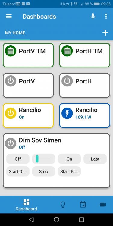 Jepp. Gå på lyspæra nederst så komme alle device opp, evt filtrer på room og floor for å begrense utvalget. Trykk på de 3 prikkene og velg "Add to dashbord". Dashbordet vises med knappen nede til venstre og du kan ha mange dashboards. Hver enkelt device kan også konfigureres ved å ta bort unødvendig informasjon. I dashbordet kan du også redigere og resize men selve designet er fastlåst men ser nå ganske ok ut synes jeg. Slik har jeg betjening av mine viktigste enheter ? Garasjeporter med tilbakemelding, espressomaskinen og lyset på gutlarven sitt rom.: Symbolene som kommer opp er de samme som i "Status graphics" for hver enkelt device. Jeg endret de på Port TM slik at de viser åpen/lukket Port i stedet for de standardsymbolene med "mann i bevegelse/i ro" så dukker de automatisk opp i HS Mobile.