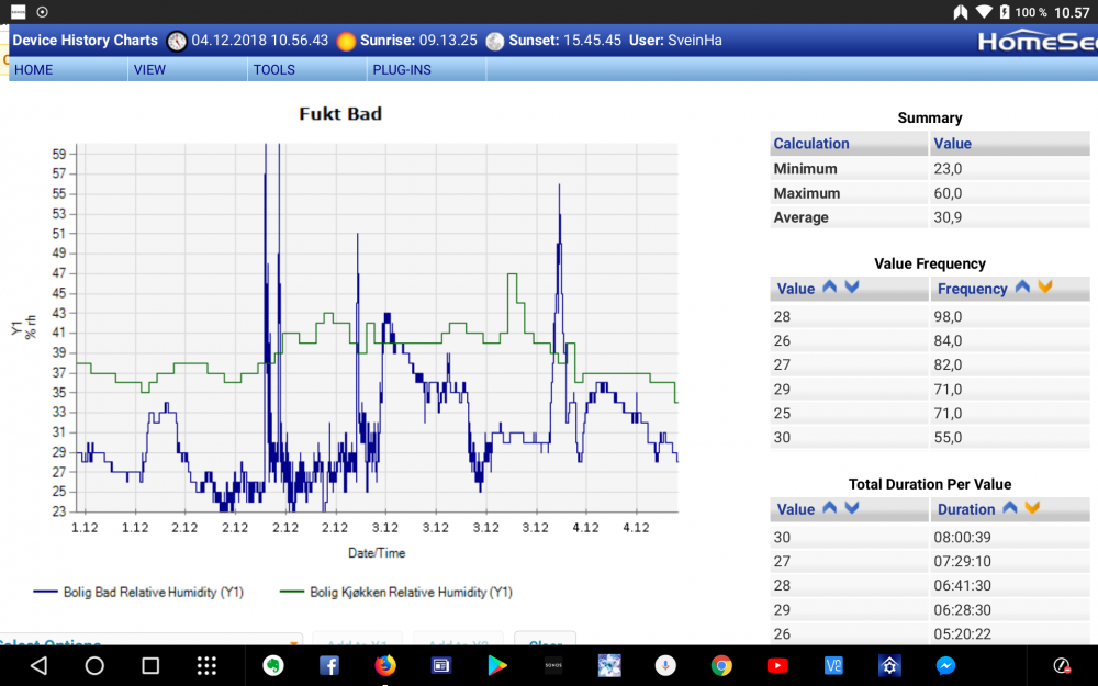 Det gir jo en enkel og helautomatisk løsning. Jeg har Aeotec multisensor både på badet og i gangen utenfor badet og ser jo at badet alltid ligger under gangen i fuktighet siden badet alltid er varmere. Ved dusjing o.l. stiger fuktigheten på badet raskt til over gangens nivå. Jeg har også et 10 minutt forsinket event for å stoppe viften. Liker å gjøre ting enkelt for det har lett for å fungere mer pålitelig... Siste 3 dager her: