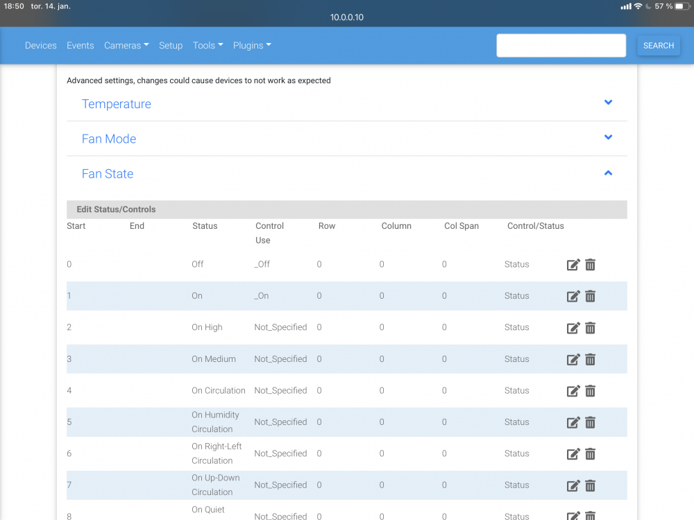 22. Tror kanskje det har noe med oppsettet av vifta. Ihht Homeseer support: Please disable voice control for all devices, this can be done by using the check box and drop-down list directly under the words Device List, as seen in the screenshot.You will also want to delete all voice entries for all of your events as well.Once you use the check box to select all devices, you will want to use the drop down menu to select Disable Voice. Then, you will want to go through your device list and click the check boxes for the devices you would like to control. There are two rules about enabling voice control:The device must have controls on the right hand sideThe device must be on/off, dimmable, or thermostat controls.