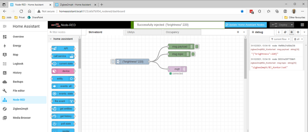 15. Ok, flott, takk, satt opp følgende rekke: Og fra debug fikk jeg da: Så alt vel sålangt... Men hvis jeg da f.eks. skal endre brightness skal dette gjøres slik: zigbee2mqtt/BJ_Kontor/set' with data '{"brightness":120}' Hvordan gjør jeg det?