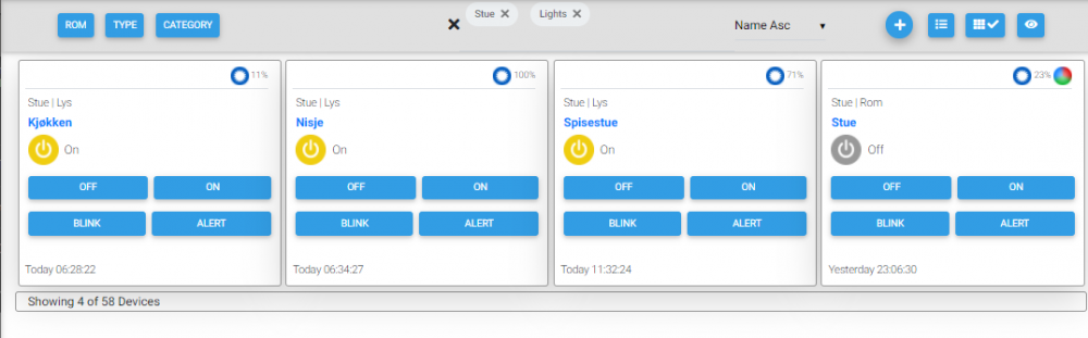 13. Hei, jeg har en liten utfordring. Bruker Philips Hue, men ser at lys-status i ett rom ikke opprateres automatisk. Har for eksempel 3 lys i sonen jeg har definert som stue: Hvorfor oppdaterer ikke "Stue" seg? Stue er da her ett Philips Hue rom.
