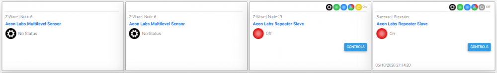 4. Takk for svar. Virker som om den gamle Repeater noden nå har blitt noe annet Har 1 stk repeater som vises som 2 devicer: Så jeg kjører da "Test connectivety" på den til venstre (node 19) og får som svar: "Successfully sent a frame to node 19 (Soverom Repeater Aeon Labs Repeater Slave) which was acknowledged." Gjør det samme på node 17 (den til høyre) og får: "Successfully sent a frame to node 17 (Soverom Repeater Aeon Labs Repeater Slave) which was acknowledged." Kjører rescan på node 19: Kjører rescan på node 17 (Aeon Labs Repeater Slave) (som nå ser ut som noe helt annet!)