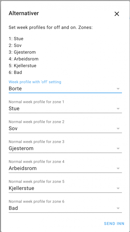 Da nærmer async-versjonen seg å bli ferdig! Neste steget er å få en full integrasjon inn i HA. Det største problemet jeg har støtt på så langt, er å lage brukergrensesnitt for å konfigurere ukesprofil for "på". Det er ikke støtte for å legge konfigurasjon på en `ClimateDevice` (altså hver enkelt sone), dermed så må konfigurasjonen settes på plattformen (slik det gjøres i dag). Det er heller ikke støtte for dynamiske feltnavn, kun dynamisk beskrivelse øverst, så antall soner som skal kunne skrues på må hardkodes, så UI blir litt rart (se under). Jeg tenkte å legge inn maks 16 soner - er det tilstrekkelig, eller er det noen som har fler soner enn det?