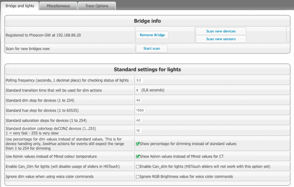 Sorry, da har ikke jeg så my mer å komme med. Har deCONZ 2.05.57 (mulig det kan bety noe, men vet ikke sikkert) og JowiHue 2.0.2.15, og under har du skjermbildekopi av JowiHue konfig, uten at jeg tror det betyr noe. Selv savner/sliter jeg med å få videreført mulighetene til å kontrollere fargene over til HomeKit på iPhone/iPad (sterkt ønske fra "statsministeren" her i huset - eneste hun aksepterer å bruke...). Er "koblet sammen" via homeBridge-homseer-bridge-2018, noe som fungerer overraskende bra, men der jeg ikke har funnet ut av dette med fargekontroll.