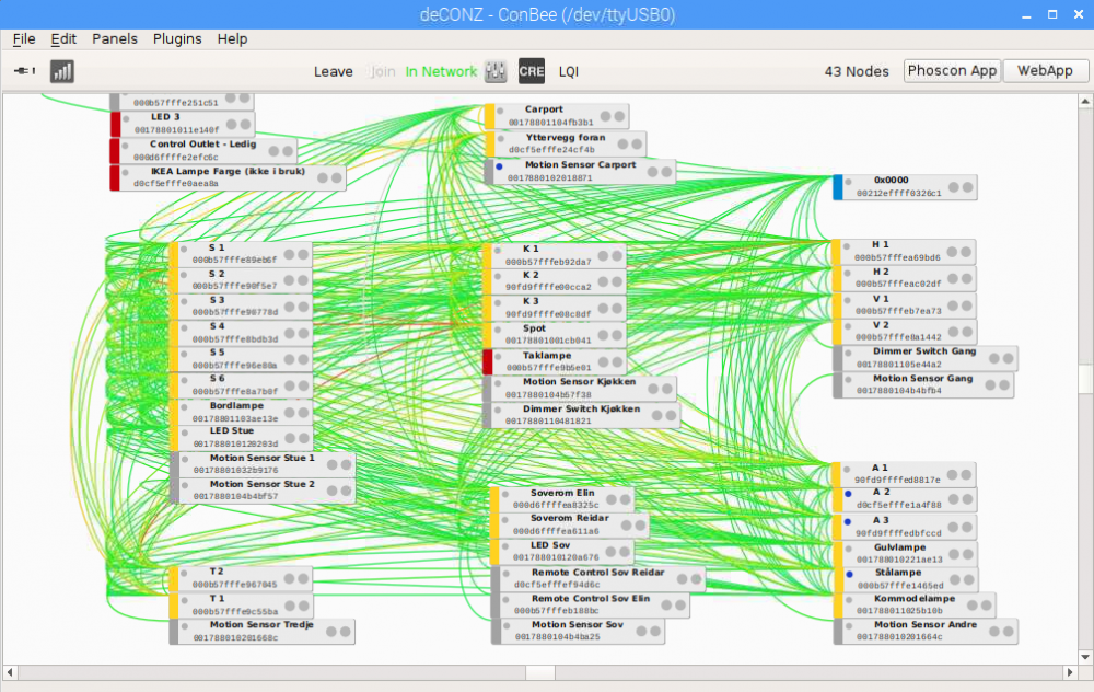 Er nybegynner innen hjemmeautomasjon (HS3 på Raspberry). Så langt stort sett bare lys og automatisering av dette ved bevegelses sensorer. Mesteparten av dette er Zigbee basert (Philips Hue og IKEA Trådløs via ConBee). Har noen få Z-Wave greier også (diverse brytere, bruker Aeon Labs Z-stick). Videre utvikling av løsningen vil antageligvis medføre flere Z-Wave komponenter. Har i dag en veldig enkel og grei totaloversikt over alle Zigbee nodene i deCONZ (se skjermbildekopi under). Ser her kjapt og overordnet hvilke noder som funker/funker ikke. Finnes det noe tilsvarende for Z-Wave?