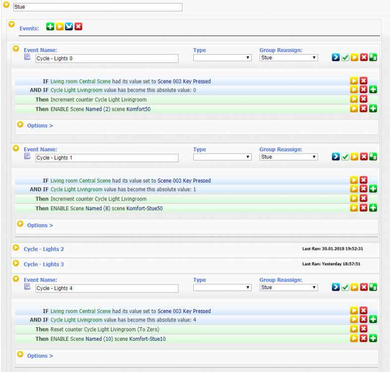 Eg har gjort følgende som kan minne om det du trenger. Eg har laget ein counter "Cycle Light Livingroom" verdien av den avgjør kva scene som kjører.