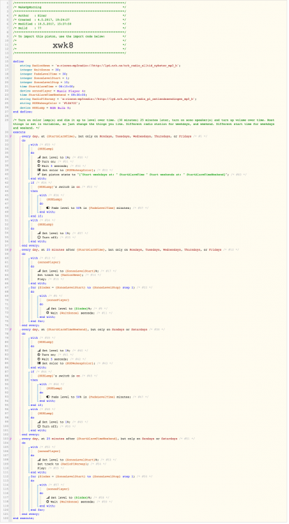 Har laget en WebCoRE piston som med en hue lampe og en sonos høyttaler lager mindre plagsomme morgner. Det meste kan settes i variabler her. Tar høyde for hverdag og helg, NRK alltid nyheter i uka, og NRK p1 i helgen. Her kan man bytte til hva man vil. Den starter opp lyset 30 minutter før jeg skal stå opp og går opp til 50% over denne tiden. Når det er 5 minutter igjen så starter sonos opp på 1% og går til 10% på 5 minutter. Faktisk en helt ok måte å våkne på. Feriemodus og lignende får du putte på selv, eller bare velge å pause piston.