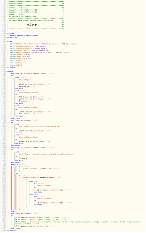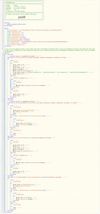 God oppsummering etter min mening. Når det gjelder "device handlere" støtte for enheter som ikke er native støttet så er det laget fryktelig mye der ute, og kan lastes ned helt gratis. Dette finner du ut av utover. Smart apps for automatisering er det samme. Når du føler at du har tid og lyst så gå rett på WebCoRE, er ikke mye du ikke kan automatisere der. Jeg har et lite hav av automatiseringer gjort i dette verktøyet. Alt gjøres via en browser, og du får full oversikt over statuser i samme verktøy. En gylden ting er at automatiseringene du lager "pistons" kan man dele mellom hverandre. Eks så kan jeg lage en og du kan få en kopi av den rett inn hos deg. Dette har gjort at det har begynt å bli et helt fora fult av folk som hjelper hverandre med løst og fast. Her er et par eksempler. 1 som er vekkeklokka mi. med radio fra sonos og wakeup lys fra philps hue. 2 en som styrer div utelys i løpet av døgnet. Det er sikkert noe "grøbbel kode" fordi jeg tester mye rart, men de funker og er mer for at du skal få et par tips. Mine "pistons" kan du importere rett i WebCoRE ved å bruke koden som står i bildene.