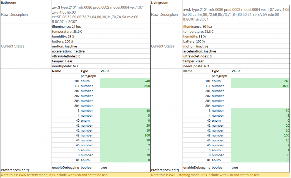 Da har Snømannen laget tall og grafer. En som funker greit, og en som er på trynet. Bathroom gjennomsnitt 742 sekunder, og Livingroom snitt på 66 sekunder Begge samme firmware, begge unsecure join, begge med akkurat samme innstillinger. Bathroom har klart å joine seg som battery mode selv med usb tilkoblet, og usb er valgt i settings. Dog skulle dette ikke ha noe å si på rapportering på inactive slike jeg ser det.