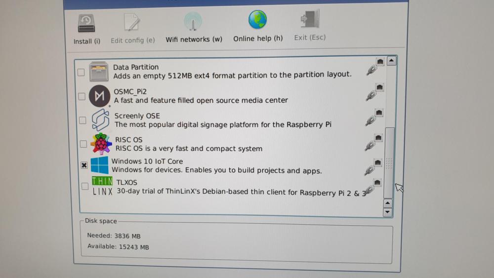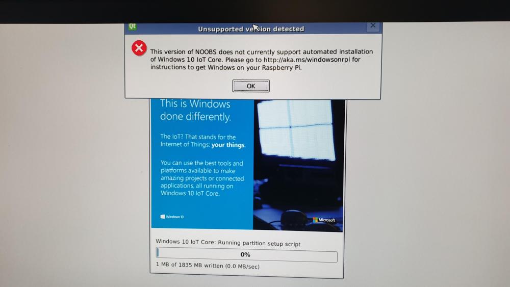 Prøver meg på Windows IoT på Rasberry Pi3b+ Har et 16Gb SDkort som skal være klasse 10 Først via Windows 10 IoT Core Dashboard - https://docs.microsoft.com/en-us/windows/iot-core/connect-your-device/iotdashboard Får opp dette skjermbilde, og kommer ikke videre Det går ikke, så via Prøver så å innstallere Windows IoT via Rasberry og prøve å bruke noobs lite https://www.raspberrypi.org/downloads/noobs/ Her velger jeg Windows 10 IoT Core Men får beskjed som bilde under her, om at det ikke går. Noen som vet hva som er galt? Går inn på http://aka.ms/windowsonrpi som åpner https://docs.microsoft.com/en-us/windows/iot-core/connect-your-device/iotdashboard Så prøver jeg igjen med Windows 10 IoT Core Insider Preview med toolet man laster ned herfra https://www.microsoft.com/en-us/software-download/windowsiot og velger Insider Preview. Kjører programet, laster ned Insider Preview og innstallere det på SD kortet. Får opp samme skjermbilde, og kommer ikke videre. Hva kan være galt? Samme bilde