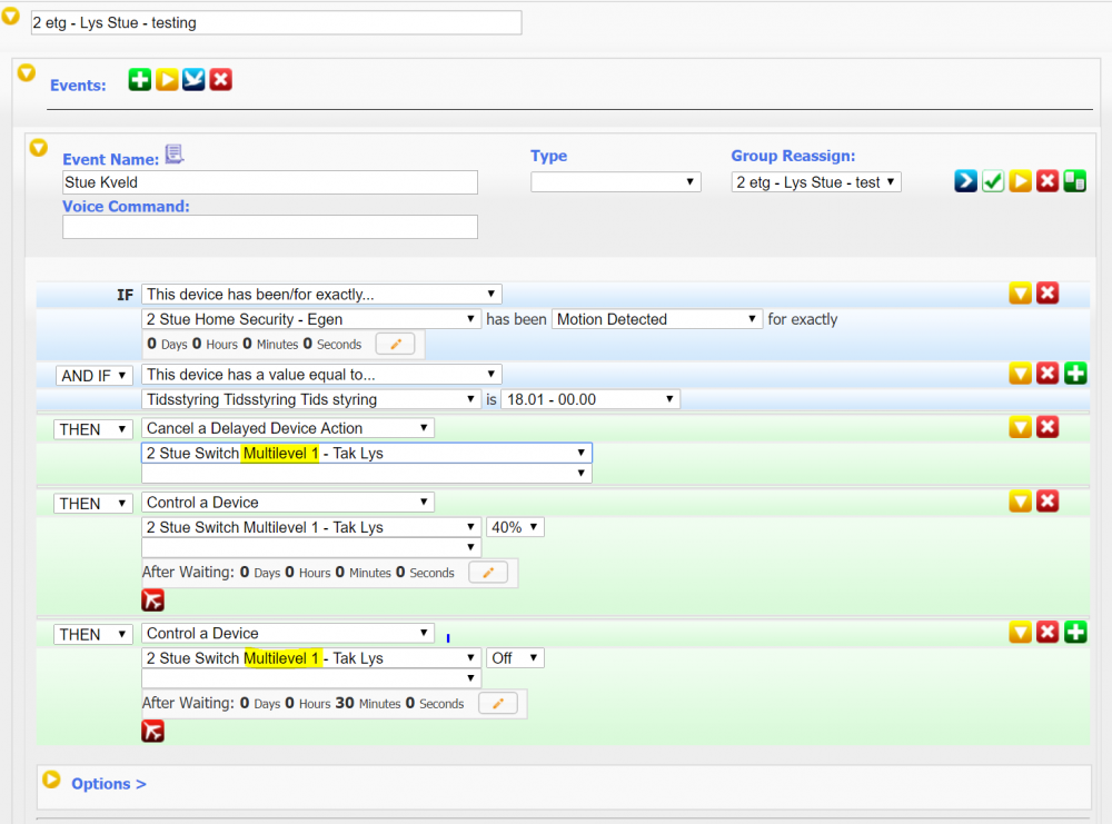 9. Da har jeg satt opp dette, og det ser ut som det fungere, men bør man ha med "Then Cancel a Delayed Device Action" på 2 Stue Scene Activation - Tak Lys OG 2 Stue Switch Multilevel - Tak Lys(gulet ut) på Stue MAX Lys.