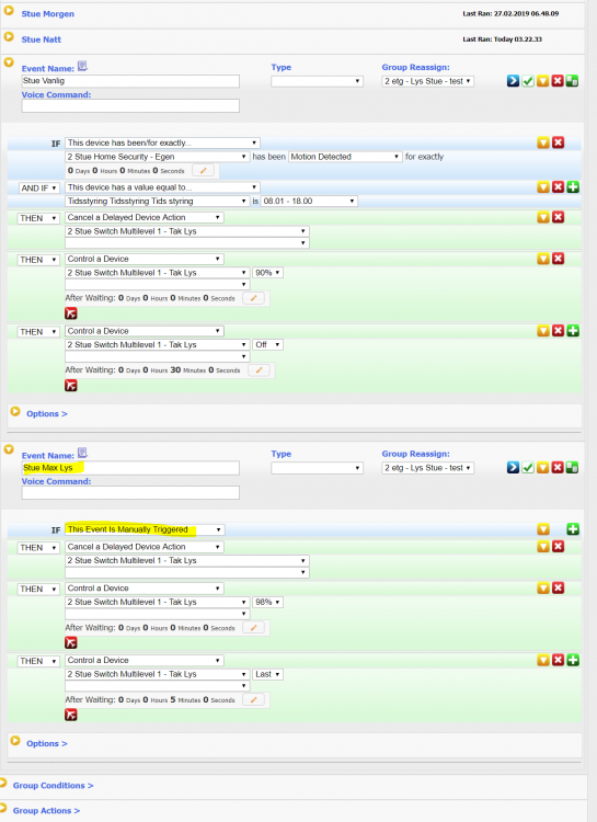 15. Kjører det meste på auto nå, men av og til ønsker jeg f.eks max lys, og da trykker jeg et dobbel klikk på bryteren, og lyset går til maks. Men det går tilbake til det som er satt for tidsstyringen. Lager først egent event for det sammen med resten av event som styre stue lys. Er det slik for å få dette til å virke må jeg sette inn IF This event MANUALLY triggered - Then set lys til max? Er dobbel klikk på bryter samme som Manually Triggered i HS3?