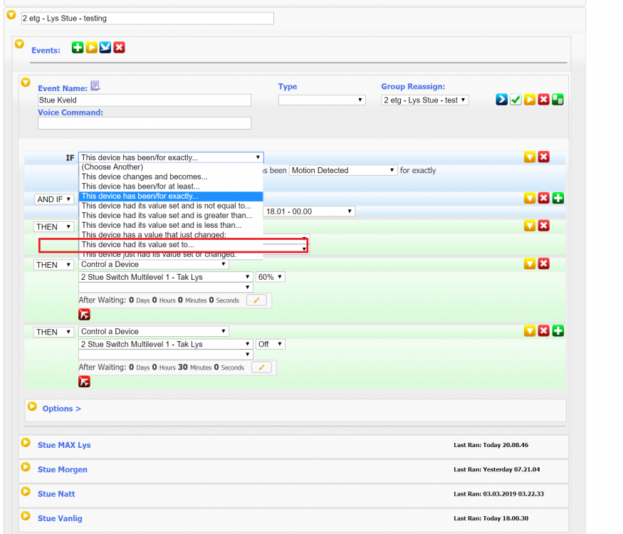 14. Ser nå når jeg gikk igjennom stuen, da gikk lyset til normalt etter tid & bevegelse. Men lyset gikk ikke tilbake til LAST etter de 5 minuttene som ble satt (i Stue Max Lys). Dvs at jeg ønsker lyset skal gå tilbake til det som var før Manually Triggered.