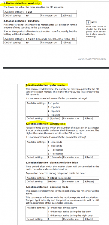 1. Skal øke følsomheten på FIBARO MOTION SENSOR, og lurer på hvilke settings som er lurt å forrandre på. Når vi er i TVStue, så ser den oss ikke så godt, og dimmer lyset selv når vi er i rommet. Så tenker å øke følsomheten litt. Hva bør en forrandre? Hvilke av de gule er lurt å forrandre på?