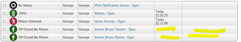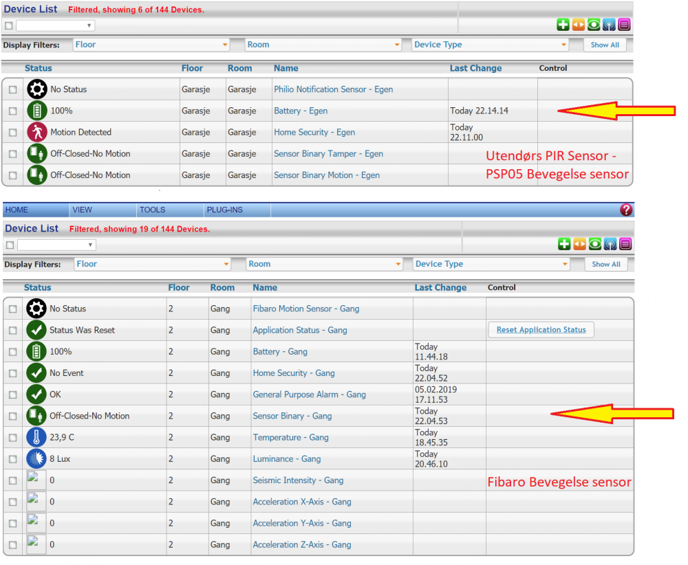 Fibaro bev. sensor vs Utendørs PIR Sensor - PSP05 Kjøpte en "lang distanse" bevegelse sensor Utendørs PIR Sensor - PSP05 Ser ut som den PSP05 tar bevegelse på batteri, der Fibaro tar bevegelse på Sensor Binary(se piler på bilde). Dvs vær gang jeg tar handen foran sensor, så oppdatere den batteri status, og ikke noe på Sensor Binary Tamper/Motion. Home Security kan "se" noe... Info på Utendørs PIR Sensor - PSP05 Prøver å sette dette opp, og da blir det jo ikke riktig.... Når den ikke registrerer bevegelse på Sensor Binary Motion???