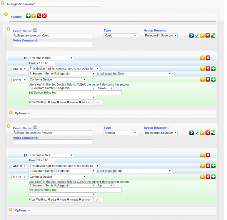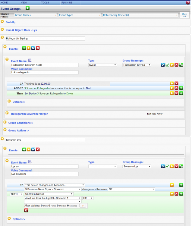 Men så er det en annen ting, jeg ser for meg at jeg må lage små event som: - KUN slå på lys i stue - KUN slå av lys i stue - KUN slå på lys i bad - KUN slå av lys i bad - KUN slå på lys i gang - KUN slå av lys i gang Og sette de opp med events, og tider og happenings opp i mot disse små event over her. Men greier ikke å få det bilde inn i hodet enda....