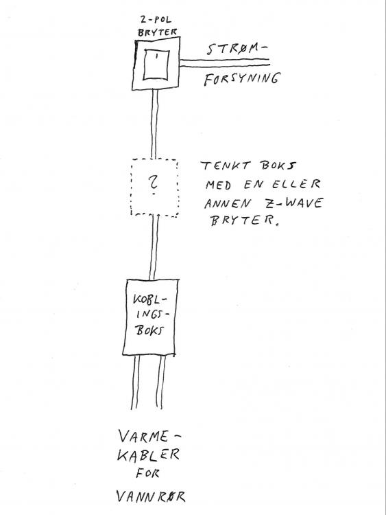 Hei, Lurer på om noen har et tips om en Z-Wave av-/på-bryter for fast installasjon? Den skal styres fra Telldus, og er for å slå av og på varmekabelen på vannrøret inn til en hytte. Kabelen er koblet til fast installasjon via en to-polet bryter og en koblingsboks (det vil si det er faktisk to kabler ut fra koblingsboksen, som er koblet sammen, så jeg antar det er to varmekabler). Se vedlegg. Jeg har ikke tenkt å klusse med faste installasjoner på denne hytta selv (spesielt siden det ikke er jeg som eier den), så jeg må bruke elektriker. Men tenkte at jeg kanskje kunne kjøpe inn bryteren selv, etter eventuell anbefaling, og få elektrikeren til å montere den. Er ikke sikker på hvor mange watt kabelen drar, men det er neppe over 2 KW.