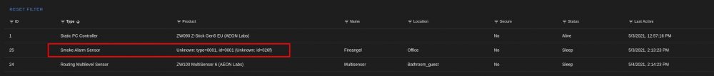 Hjemme hos oss gikk vi for FireAngel SM-F-NEUT i alle rom, med 4-leder kabel mellom for link. Nå hadde det vært kjekt å få dette inn i HomeAssistant, så jeg kjøpte én ZW-MODULE som passer til denne. Målet er å få varsel i appen om vi er borte, og gi flombelysning om vi er hjemme, når alarmen går. Her er så langt jeg har kommet: Siden jeg kjører Zwave2MQTT tenkte jeg igrunn dette ville gå rett fram, noe det halvveis gjorde. Jeg fikk lagt til enheten i Z2M, men den rapporterer ikke "riktig": Inne i Home Assistand så får jeg device som har følgende entiteter: Når jeg tester røykvarsleren så endrer sensor.nodeid_25_alarm_smoke seg til "Smoke test" eller noe i den duren. Nå har jeg kommet så langt at jeg har prøvd å simulere brann her, så spørsmålet er igrunn; hvordan ser det ut i HA når alarmen faktisk går? Hva kan jeg "lytte" på for å gjøre automasjoner når det er alarm? Nå kommer jeg sikkert til å forske på dette selv i løpet av uken om ingen kommer meg i forkjøpet, derfor lager jeg denne posten for å dele litt kunnskap
