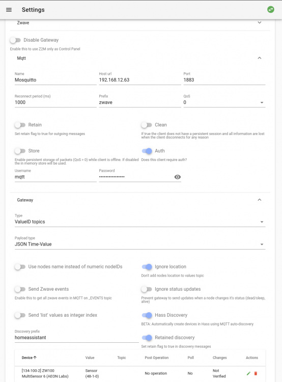 Bruker mosquitto addon selv, og det fungerer utmerket. Bilde fra zw2mqtt I Homeassistant har jeg i configuration.yaml: mqtt: discovery: true discovery_prefix: homeassistant broker: localhost username: mqtt password: !secret mqtt_password Og så dukker resten opp i Configuration -> Integration -> MQTT Discovery Edit: ZWave2MQTT v3.0.2 HA 0.108.6