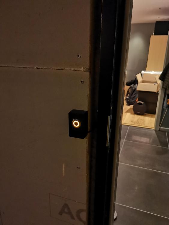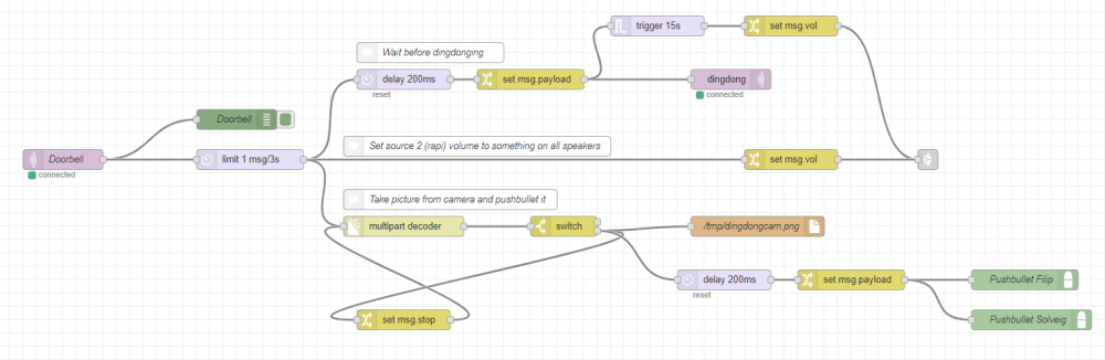 Ringeklokke! Endelig har vi fått oss ringeklokke. Igjen så ønsket jeg ikke noe som går via en app og en fremmed sky, så det ble til å lage selv. Ble litt inspirert av The Hook Up https://www.youtube.com/watch?v=xCQoOZNdaGY og bestemte meg for å teste NodeMCU, bare en litt forenklet utgave. Løsningen ble en enkel trykknapp som er koblet til NodeMCU, som bare sender en payload over MQTT. NodeRed tar over og gjør litt forskjellig: Setter kilde 2 volum for alle rom til 40% Sender payload over MQTT til RaspberryPi som spiller av dingdong. Venter og setter kilde 2 volum til 0% igjen Fordelen med denne løsningen over en kjøpeløsning er at jeg benytter høyttalere som allerede er i huset til å spille av ringelyd, så i stedet for ekstremt høy ringelyd fra én høyttaler, så spiller vi av ringelyd i alle rom på lavt behagelig volum Utedelen består av en trykknapp i en boks, med ledning inn til NodeMCU, som stjeler strøm fra tablet. Ikke den peneste løsningen (fra utsiden) per nå, men det fungerer. Skal se hva jeg gjør ute før jeg legger mer arbeid i det. Snasent med gult lys i knapp til gul inngangsdør ? Edit: Oppdaterte node-red flow og la til at den skulle plukke ut et bilde fra mjpeg-streamen på overvåkningskamera og sende via Pushbullet. Så det hele ble en slags fattigmann-versjon av Ring/DoorBird/etc. Må bare montere opp kamera på rett plass Akkurat nå tar den bilde fra garasja.