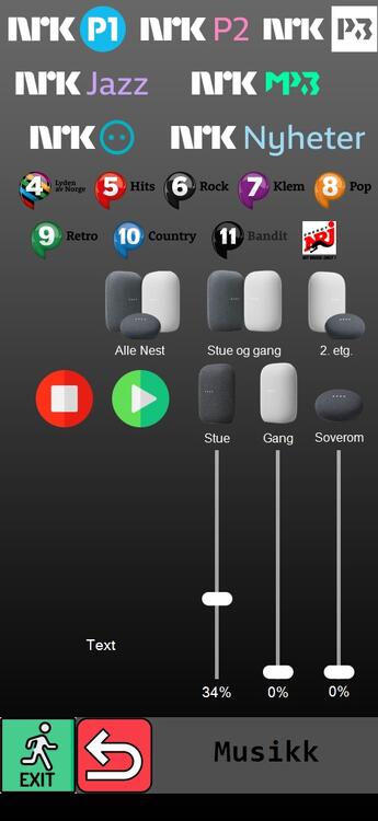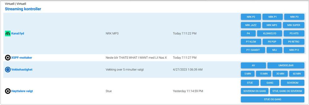 21. Det er ikke løsningen du spør etter, men i Homeseer bruker jeg script som setter en device value, basert på hvilken kanal som er valgt i en annen device. På den måten får jeg opp metadata om sang, artist/program osv. I HS Touch vises logoen til radiokanalen som spilles, men jeg har ikke funnet noe måte å hente inn det bildet som kommer opp på DAB-radioer. Imports System.Collections.Generic Imports System.Net Imports System.Text ' ChatGPT - May 2, 2023 Sub Main(ByVal Parms As Object) Dim radioChannels As New Dictionary(Of Integer, String) radioChannels.Add(10, "https://lyd.nrk.no/nrk_radio_p1_buskerud_aac_h.xspf") radioChannels.Add(20, "https://lyd.nrk.no/nrk_radio_p2_aac_h.xspf") radioChannels.Add(30, "https://lyd.nrk.no/nrk_radio_p3_aac_h.xspf") radioChannels.Add(40, "https://lyd.nrk.no/nrk_radio_alltid_nyheter_aac_h.xspf") radioChannels.Add(45, "https://lyd.nrk.no/nrk_radio_p13_aac_h.xspf") radioChannels.Add(50, "https://lyd.nrk.no/nrk_radio_jazz_aac_h.xspf") radioChannels.Add(60, "https://lyd.nrk.no/nrk_radio_mp3_aac_h.xspf") radioChannels.Add(70, "https://lyd.nrk.no/nrk_super_aac_h.xspf") ' Add additional radio channels here Dim radioChannelDeviceRef As Integer = 964 Dim radioChannelValue As Integer = hs.DeviceValue(radioChannelDeviceRef) If radioChannels.ContainsKey(radioChannelValue) Then Dim xspfUrl As String = radioChannels(radioChannelValue) Dim xmlDoc As New XmlDocument() ' Download the XSPF file from the URL Using webClient As New WebClient() Dim xspfBytes As Byte() = webClient.DownloadData(xspfUrl) Dim xspfContent As String = Encoding.UTF8.GetString(xspfBytes) xmlDoc.LoadXml(xspfContent) End Using Dim nsManager As New XmlNamespaceManager(xmlDoc.NameTable) nsManager.AddNamespace("xspf", "http://xspf.org/ns/0/") Dim trackList As XmlNodeList = xmlDoc.SelectNodes("/xspf:playlist/xspf:trackList/xspf:track", nsManager) ' Example: Extract track titles and display them in HomeSeer Dim trackTitles As New List(Of String) For Each trackNode As XmlNode In trackList Dim titleNode As XmlNode = trackNode.SelectSingleNode("xspf:title", nsManager) If titleNode IsNot Nothing Then trackTitles.Add(titleNode.InnerText) End If Next ' Set a device string to display the track titles Dim deviceRef As Integer = 965 ' hs.WriteLog("XSPF-Mottaker", "Track titles: " & String.Join(", ", trackTitles)) ' hs.WriteLog("XSPF-Mottaker", "Device ref: " & deviceRef.ToString()) hs.SetDeviceString(deviceRef, String.Join(", ", trackTitles), True) 'Else ' hs.WriteLog("XSPF-Mottaker", "No URL found for the selected radio channel (Value: " & radioChannelValue.ToString() & ")") End If End Sub