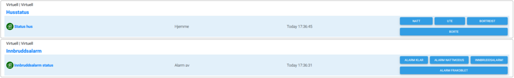 Tenkte å vise min løsning ift. innbruddsalarm. Det finnes sikkert mye enklere måter å sette det opp på, men jeg synes egentlig at systemet fungerer veldig bra og stabilt (mitt problem er at PC'en som systemet går på har blitt ustabil). Også gjenstår det en del jeg har tenkt å gjøre for å få systemet til å fungere enda bedre, men det er en innbruddsalarm helt uten no abonnementskostnad som jeg er veldig fornøyd med. Nedenfor er et bilde med en del events, og en kort forklaring på hvordan dette henger sammen dersom det ikke er åpenbar 1: Event som setter en virtuell device "Innbruddsalarm" fra "Alarm Klar" til "Forvarsel" dersom ytterdøra åpnes. Jeg har tilsvarende event for alle dører og bevegelsessensorer i huset. Denne starter også en timer på 1 min. 2: Dette er egentlig bare en utskilt del av eventen over som leser ut et advarsel i Google-høyttaleren frem til alarmen avstilles eller utløses. 3: Hver dør og bevegelsessensor har også en event som varsler om dersom det åpnes flere dører eller flere bevegelsessensorer utløses. På denne måten er det enkelt å se om det bare er en sensor som er utløst ved en feil, eller om det faktisk er folk i huset. I så fall kan jeg varsle politiet direkte og si at det er ubudne gjester i huset (ikke vente på at en vekter kommer og sjekker). 4 og 5: Dersom timeren har gått i ett minutt vil alarmen utløses. Da blir det veldig lyst både ute og inne, rullegardinene går opp, og Googlehøyttaler dama begyner å snakke veldig mye og høyt. Poenget her er å stresse eventuelle innbruddstyver, og å så dem til å skjønne at de er avslørt og bør stikke fort som fy.