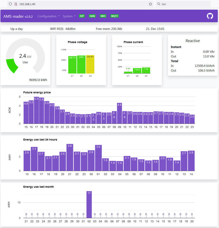 Lesing av AMS data (AMS/HAN -> IoT)tronde svarte på roarfred sitt emne i Strømsparing og strøm-overvåkning @gskjold Jeg oppdaterte den ene til 2.0.2 rett før midnatt. Den viste korrekte priser før, og helt feil etter. Den andre oppdaterte jeg et par minutter etter midnatt. Den viste ingen priser før, og de samme gale som den første etter oppdateringen. Nå 0130 slettet jeg API nøkkel i den ene, og la den inn på nytt. Da hentet den inn korrekte priser. Da gjorde jeg det samme på den andre, som også viser korrekte priser nå. For meg ser det ut som om et eller annet minne henger. Hvor ofte spør den etter nye priser? Jeg skal gjerne være med å teste hvis det er noe du vil prøve ut, men jeg er ikke i stand til å se fra koden hva jeg bør være på jakt etter. Jeg har levd av feilsøking på andre ting, så jeg har stor tålmodighet med testing når det ser ut til å ha en hensikt, og jeg har to ESP32 som går parallelt som kan konfigureres ulikt. Gale priser NO1: Korrekte priser NO1: