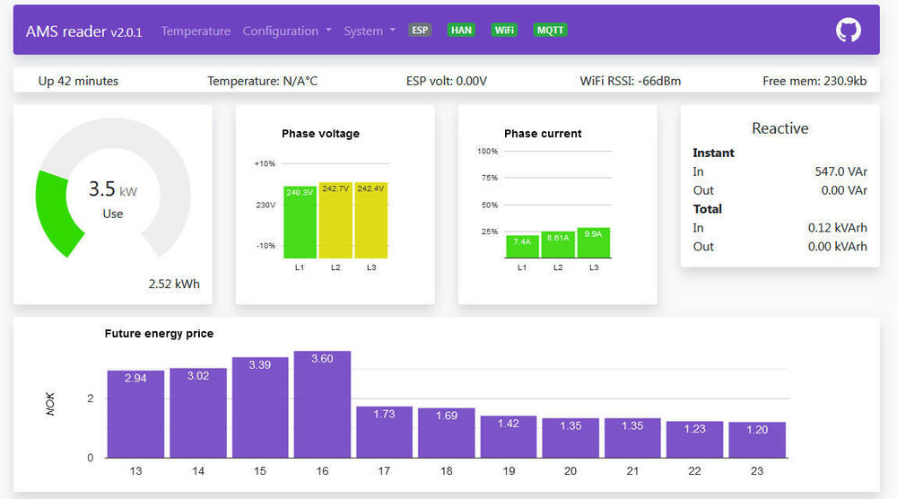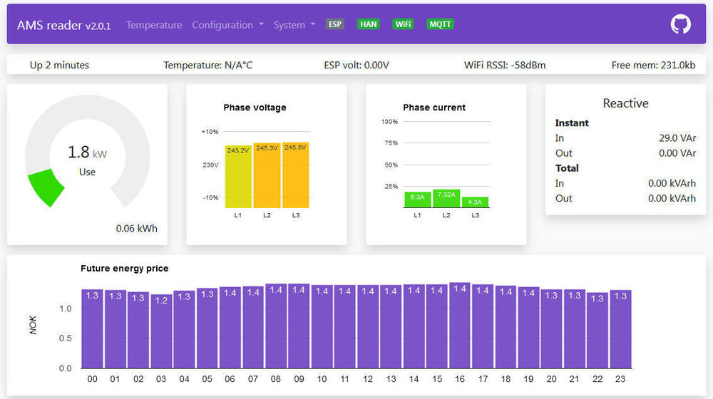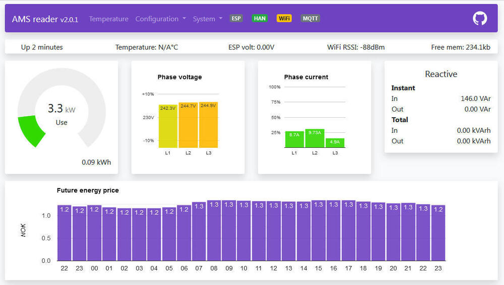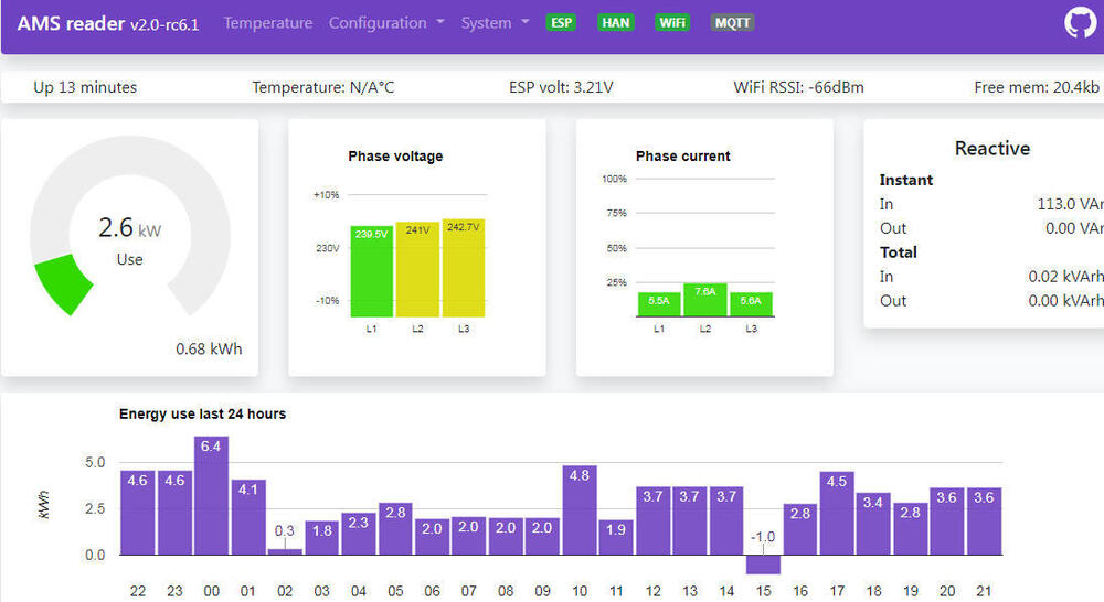 Lesing av AMS data (AMS/HAN -> IoT)tronde svarte på roarfred sitt emne i Strømsparing og strøm-overvåkning @gskjold Litt mer å fikse 😊 Da jeg holdt på med GPIO-settingen, var det noen ganger at API-nøkkel for strømprisene ble slettet, uten at jeg helt kan se hvorfor. Minner litt om det som skjedde da den ikke klarte å huske valgt prisområde. Nøkkel ble erstattet med "r" da jeg oppgraderte til V2.0.0. I begge tilfelle forsvant også visningen av prisene. * I den generelle beskrivelsen av prosjektet på Github står det: Later development have added Energy usage graph for both day and month, as well as future energy price. The code can run on any ESP8266 or ESP32 hardware which you can read more about in the WiKi. Selv om det står i wikien, skader det nok ikke å presisere at strømpriser krever ESP32, for det gis inntrykk av at begge ESP-ene gir den funksjonen. * I wikien under "Meter configuration" står det "Substitute missing values - For IT/TT distribution system, calculate current for L2". Den funksjonen er ikke synlig i konfiguarsjonsmeyen. Jeg ser helst at den kommer tilbake, for det ser litt corny ut med negative strømmer som man ofte får når det er skjev belastning i nettet. To desimaler er også i overkant. Null desimaler er nok når svaret stort sett er helt utenfor. * I wikien under "Initial setup" står det "WiFi - SSID and PSK for the network you want your device to connect to. If you also want to set static IP, read more here" Linken til https://github.com/WiFi-Configuration er død.