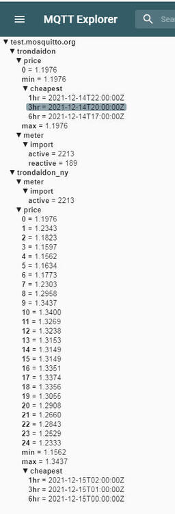 Lesing av AMS data (AMS/HAN -> IoT)tronde svarte på roarfred sitt emne i Strømsparing og strøm-overvåkning Fint. Jeg har hittil bare brukt den androidklienten jeg linket til for å se om jeg fikk ut noe på en skjerm. Der funker det med $.data.P for effekten og f.eks $.data.U1 for spenning U1 osv. etter det som står i anførselstegn i denne oversikten over liste 1 til 3. https://github.com/gskjold/AmsToMqttBridge/wiki/Message-formats Da er jeg vel på trygg grunn på klientsiden inntil videre. Det som jeg synes er forvirrende her, er at det står ingen ting om "meter/import" under Json i wikien, men det er mange henvisninger til en hierarkisk struktur med blant annet "meter/import" i beskrivelsen over raw mode i denne linken https://github.com/gskjold/AmsToMqttBridge/wiki/MQTT-configuration Når jeg prøvde med klienten uten å aktivere Json, kom det ingen ting selv om det var valgt Raw i adapteret, så det forvirret enda mer. Det ser ut som om om jeg får tak i de verdiene jeg vil med "meter/import", så da har jeg vel gjort ca. rett da, selv om det ble med en ekstra "/" Da kan jeg grave videre i hva for noe fornuftig jeg kan få ut av dette i forvisning om at det grunnleggende er riktig. Selv om jeg skjønner ca. hvordan MQTT er ment å virke, er det alltid noen detaljer som mangler. @gskjold Bug i henting av strømpriser. Morgendagens priser ble ikke hentet inn før jeg tok omstart av interfacet. Det er det interfacet jeg brukte til prøve MQTT, og MQTT var aktiv hele tiden, men jeg vet ikke om det har en sammenheng. API-nøkkel var lagret før jeg tok omstart, så det jeg har gjort med MQTT ser ikke ut til å spise den opp slik GPIO-config noen ganger har gjort. Jeg sjekket at ENSTOE hadde publisert nye priser før jeg tok omstart.