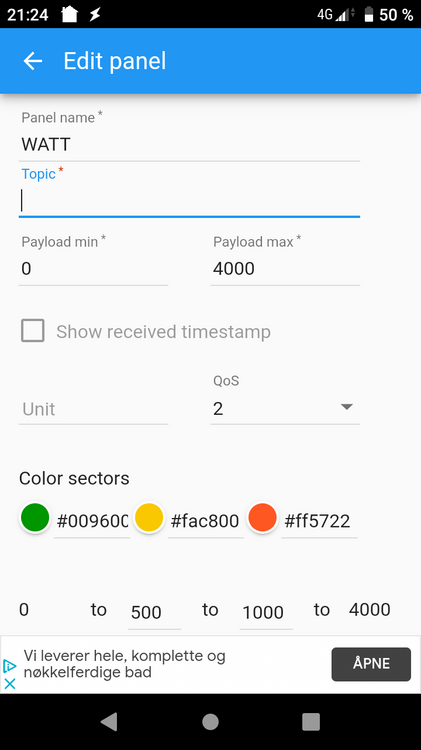 Lesing av AMS data (AMS/HAN -> IoT)tronde svarte på roarfred sitt emne i Strømsparing og strøm-overvåkning Jeg prøver med med MQTT, men skaller i veggen. For snart to år siden fikk jeg til noe, men nå er det full stopp... Jeg vil prøve med ekstern broker, for jeg vil vise noe til dem som har fått et adapter av meg. Ingen av brokerne ser ut til å like at mottaker er på samme IP som sender, men det løser seg ved å ha mottaker på mobildata. Da blir i alle fall ingen av dem koplet ned. broker.hivemq.com ser ut til å være samarbeidsvillig. Jeg vet at sender og mottaker må ha samme Client ID. Hva skal jeg sette inn i feltet for "Publish topic" i menyen for MQTT oppsettet? Er det feltet for at jeg kan sende ut bare en verdi, eller et utvalg? Vil ikke MQTT normalt dytte ut alt som finnes? Må jeg ha brukernavn og passord, eller er det valgfritt? Jeg forstår fra wikien at det er valgfritt. Jeg prøver å få til noe med androidappen IoT MQTT Panel https://play.google.com/store/apps/details?id=snr.lab.iotmqttpanel.prod Den funket for meg sist, mener jeg å huske. Jeg får satt den opp til å holde en forbindelse åpen mot broker.hivemq.com som jeg har satt adapteret opp mot, og det viser grønn MQTT-status, så jeg regner nesten med at det grunnleggende funker i bakgrunnen. Jeg ser denne listen over topics, men jeg har vel prøvd det meste av kombinasjoner uten å få til noe. https://github.com/gskjold/AmsToMqttBridge/wiki/MQTT-configuration Er det ikke slik at {root} i listen egentlig representerer Client ID i MQTT? Hva skal jeg skrive i sender og mottaker for å få ut verdien av importert aktiv effekt? Data som raw eller JSON? I appen er et felt for Topic. Det skal vel samsvare med den verdien jeg vil hente fra MQTT, men hva skal stå der? Hvis jeg velger JSON som data, ber den om JsonPath. Der blir jeg enda mindre klok, for det jeg finner på nett sier ikke noe fornuftig til meg.