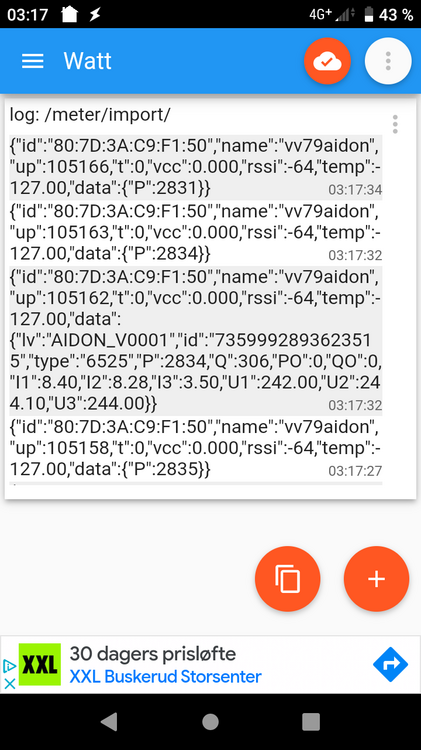 Lesing av AMS data (AMS/HAN -> IoT)tronde svarte på roarfred sitt emne i Strømsparing og strøm-overvåkning Dette innlegget er endret flere ganger, hvis noen har lest tidligere. Nå har jeg funnet en ESP32 til og satt den opp. Den hentet inn dette. Ser nå ut til å være korrekt. Den første ESP32 viser nå dette (kl 22) Dette er loggen for begge mine rett etter kl 23 hvor det tydeligvis ble sendt ut masse nye priser. De var ikke der for den nye før timeskiftet. Går prisene ut hver hele time på MQTT? Den gamle er ikke oppdatert, men den nye ser ut til å stemme med Enstoe. Begge kjører v2.0.1, men den nye ble startet opp rett over 22 nå i kveld.
