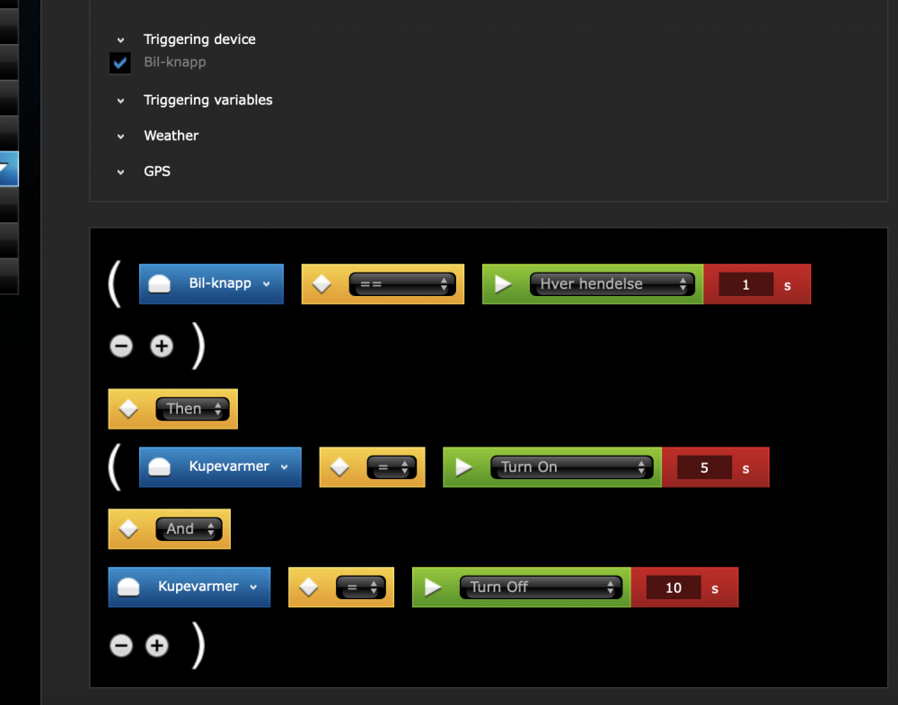 Hei! Har en Fibaro button jeg ønsker skal kjøre en scene, men sliter med at når jeg trykker på knappen så er det tydelig i HCL at trykken har blitt aktivert, men det skjer liksom ikke noe. Har opplevd flere ganger at jeg må lage scenen på nytt. Har vedlagt bilde av scenen. Den er ganske enkel, og bør fungere bra. Det har den i alle fall gjort tidligere, men etter noen dager så vil den ikke mer og jeg må lage ny scene. Merk at tiden er satt alt for lavt ift at jeg bare tester scenen på bildet. Normalt ville det vært 2400s kjøring og stopp etter 2500s. Tips til hva som kan gjøre at scenen ikke vil fungere hver gang?