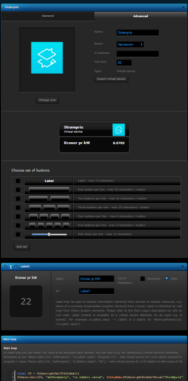 Guide til hvordan du benytter Tibber mot Fibaro HC2 for å styre varme-panelet: Nr.1: Hente inn strømpris fra Tibber: Referanse: https://marketplace.fibaro.com/items/tibber-price Lag en ny variabel i "Panels->Variables panel->Variables" som heter "Strompris" og la denne stå som null. Lag en LUA scene som heter "Hent_strompris" og sett inn kode. Her er det viktig å legge inn din Tibber ID på "XXXXXX" Du kan nå teste ut om du greier å hente verdien fra Tibber ved å kjøre scenen manuelt. Dette gjøre du ved å trykke på boksen under koden etter å ha lagret scenen (floppy-ikon på høyre side). --[[ %% properties %% events %% globals --]] if (fibaro:countScenes() > 1) then --Bare én kjøring av gangen. fibaro:abort() end fibaro:debug(fibaro:getGlobalValue('Strompris')); local http = net.HTTPClient(); local payload = '{"query": "{viewer {homes {currentSubscription {priceInfo {current {total currency}}}}}}", "variables": null, "operationName": null}'; http : request('https://api.tibber.com/v1-beta/gql', { options = { method = "POST", headers = { ['Authorization'] = 'Bearer XXXXXXXXXXXXXXXXXXXXXXXXXXXXXX', --Din Tibber ID her. ['Content-Type'] = 'application/json' }, data = payload }, success = function(response) fibaro:debug (response.data) local startIndex = string.find(response.data,'{"total":') + 9; local endIndex = string.find(response.data,',')-1; local price = string.sub(response.data,startIndex, endIndex); startIndex = string.find(response.data,'currency":"') + 11; endIndex = string.find(response.data,'}')-2; local currency = string.sub(response.data,startIndex, endIndex); fibaro:debug(price) fibaro:setGlobal('Strompris',price); fibaro:debug(currency) end, error = function(err) fibaro:debug ("Error:" .. err) end }); --fibaro:startScene(6) -- Denne er kommentert ut intill videre Nr.2. Du greier nå å hente inn Strømpris, men dette gjøres ikke automagisk. Du trenger derfor en form for "timer". Jeg har funnet at den enkleste og best fungerende timeren kan lages i blokkdiagramer, selv om jeg ikke er noe fan av denne typen programmering. Du lager altså en ny scene som du kaller noe slikt som "TimerStrompris". Denne skal se slik ut: Nr.3. Nå hentes strømprisen hver time. Dette ser ut til fungere meget bra for min del. Det neste vi skal gjøre er å sette opp en enhet som viser oss hva strømprisen er. Gå derfor til "Devices" -> "To add the Virtual Device" -> "Add" Gi denne navn "Strompris" og gå til den avanserte menyen. Under "Choose set of buttons" hak av "Label" og trykk deretter på "Add set" "Label" = "Kroner pr kW" "ID" = "Label1" huk av "main" Legg inn denne koden i "Main loop": local ID = fibaro:getSelfId(Label1) fibaro:call(ID, "setProperty", "ui.Label1.value", (tonumber(fibaro:getGlobalValue("Strompris")))) fibaro:sleep(120000) --henter oppdatering hvert andre minutt Du vil nå ha en virtuell enhet som forteller deg hva strømprisen er. Nr.4. Det neste vi skal gjøre er å lage en scene som sjekker hvordan strømprisen oppfører seg og styrer vannbåren varme i huset. Jeg har brukt Heating panel og reléer til å styre mitt system. Jeg har også en styrt ventil på varmekolben som lar varmvannet gå tilbake til varmepumpen om for mange ventiler er lukket. Vi må her opprette en tidsvariabel som global variabel akkurat slik vi gjorde med den globale variablen "Strompris". Denne gangen kaller variablen "iPris". Lag også en variabel som heter "DyrStrom" Vi lager også en Predefinert variabel som vi kaller "PrisTabell". Ironisk nok skal du IKKE definere denne. Definisjonen lager du i scenen din. Nr.5. Lag en ny LUA scene. Kall den "StromPrisSnitt". linje 14-18 beskriver en tabell som skal fungere som en initialisering av "PrisTabell". Fjern derfor kommenteringen og kjør scenen en gang. Deretter kan du fjerne eller kommentere ut dette avsnittet. --[[ %% properties %% events %% globals --]] if (fibaro:countScenes() > 1) then fibaro:abort() end -- #Inital setup of the "predefined global variable" : Pristabell --Table = { -- [1]=881,[2]=881,[3]=881, [4]=881,[5]=881,[6]=881, [7]=881,[8]=881,[9]=881,[10]=881 -- } --local jTable = json.encode(Table) --fibaro:setGlobal("PrisTabell", jTable) -- #Get Strømpris, a global variable: local pris = fibaro:getGlobalValue('Strompris') -- #Get and Decode Pristabell: local jT = json.decode(fibaro:getGlobalValue("PrisTabell")) -- #Read Pristabell for decode purpose: for k,v in pairs(jT) do print("k: " ..k..", v: "..v) end -- #Get location in the table from the global variable iPris: local i= fibaro:getGlobalValue('iPris') -- #make some local variables: local snitt = 0 local m = 0 -- #find the average price the last ten hours: while m<10 do m = m+1 snitt = snitt+jT[m] end fibaro:debug(snitt); snitt=snitt/10 fibaro:debug(snitt); -- #What is the increase in price compaired to the last ten hours: local okning = pris/snitt fibaro:debug(okning); --fibaro:debug(jT[i]); -- #Where in the table should the next price be stored: i = i+1 if (i > 10) then i=1 end fibaro:setGlobal('iPris', i) -- #Place the current price in the table: jT[i] = pris -- #is the power +10% more expencive than the 10 hour avrage? Then change a global variable called DyrStrom: if okning >1.1 then fibaro:setGlobal("DyrStrom", 1) fibaro:debug("Dyr Strom!"); else fibaro:setGlobal("DyrStrom", 0) fibaro:debug("OK!"); end -- #Save the current price in the historic price table: local jTable = json.encode(jT) fibaro:setGlobal("PrisTabell", jTable) Nr.6. Pristabellen lastes ikke inn av seg selv. Hver gang du henter en strømpris vil du legge denne inn i tabellen. I bunnen av scenen "Hent_strompris" finner du en kommentert snutt : "--fibaro:startScene(6)". Her skal du nå legge inn ID fra scenen "StromPrisSnitt". På den måten går timeren av hver time, som så starter Hent_Strompris som så legger dette inn i tabellen. Legg merke til at "iPris" gir plassering i tabellen. "DyrStrom" sier binært om strømprisen er høy i forhold til de siste 10 timer. Nr.7. Det vi nå har å jobbe m