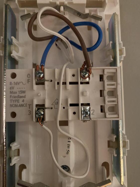 Fikk en Ring doorbell wired og har en Friedland Type 4 klokke. Ringetrafo i sikringsskap. Bilde viser korleis det er koblet idag med den dumme knappen. har prøvd å koble Ring inn på terminal 1 og 3(rett i klokka uten å fjerne knappen ute) Det blir liv i Ring, men klokka ringer ikkje, får varsel på mobilen. Er det mulig å få til Friedland til å virke i denne kombinasjonen? Følgte med en ledning med en motstand på seg. Muligens eg burde sjekket meir før eg bestilte, men slik er det med impulskjøp.