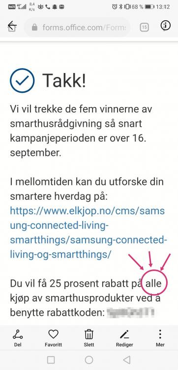 Elkjøp har anonse i dagens næringsliv. Er en konkuranse der man kan vinne 100000 til smarthus. Etter å ha deltatt så får man rabattkode til 25% til allt smarthus. MEN.... Prøver å bruke koden på diverse xiaomi s5, hue pærer osv, men får ikkje rabatt... Kundeservice er stengt til mandag så må kontakte de da. https://www.dn.no/staticprojects/annonsorinnhold/verdens-smarteste-land/elkjop/det-handler-om-aa-gjore-hverdagen-enklere/?utm_source=dnx&utm_medium=VSL&utm_campaign=front1