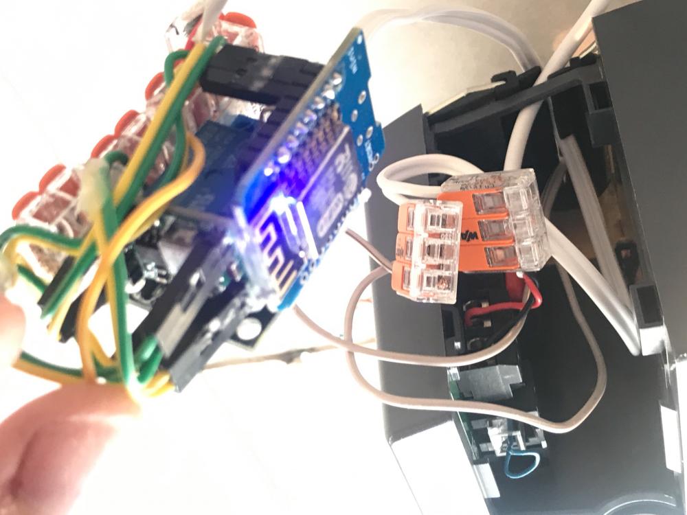 Jeg har laget et ESP32-relé selv til Hörmann-porten vår. Hörmann motoren gir 24v ut fra controllerkortet, så kan vi bruke den for å gi strøm til ESP og relé. Du transformerer 24v til 5v med transformatoren under. Den justerer du til 5v ut, og forer både ESP’n og reléet med 5v. Reléet tåler både AC og DC strøm. Jeg bruker samme som relé som strømbryter for 240V lamper. Reléet har tre tilkoblinger som er godt dokumentert, men jeg kom frem til at bryteren (reléet) alltid må sende strøm videre til den manuelle veggbryteren for at denne skal fungere, altså måtte den ene lederen som går inn og ut av reléet være koblet som Normally Open (NO). Det er de to markert med gul strek i bildet. Kun den ene lederen går forresten via releet. Den andre går utenom. Jeg har koblet reléet mellom motoren og den manuelle veggbryteren med Wago-koblinger. Enkelt oppsett: Wemos ESP32 D1 mini Relé Velg 5v-utgaven Strømtransformator Ved å definere bryteren i ESPHome (i Home Assistant) kan vi programmere funksjonalitet i et script i Home Assistant, og la bryteren slå av (kortslutte) strømmen i, eks 500 ms, altså et halvt sekund. Hörmann motoren trenger kun en slik kort impuls for å gi åpne/lukke-kommando. Fra før funker det på samme måte med den manuelle veggbryteren, altså at motoren starter eller stopper når bryterens to ledere kortsluttes. Wemos MINI D1 ESP32 https://a.aliexpress.com/_mqmpejj Relé https://a.aliexpress.com/_mMoy1K9 Transformator 4.75-23V to 1-17V https://a.aliexpress.com/_mKE87a5 Her er scriptet jeg bruker for å kontrollere reléet. Her er ESPHome-scriptet mitt.