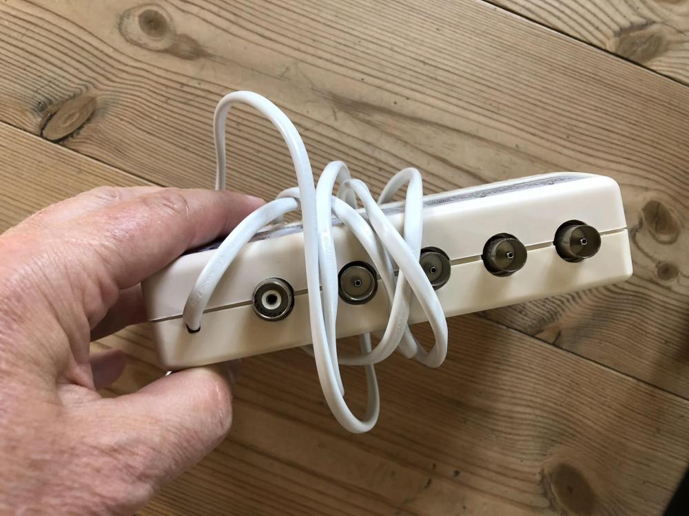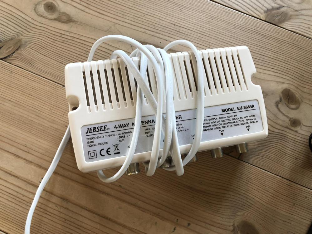 Digital tunerne krever kraftig signal så jeg legger ved en antenne forsterker som også er grei for å dele signalet, samt USB kabler og antenne kabler.